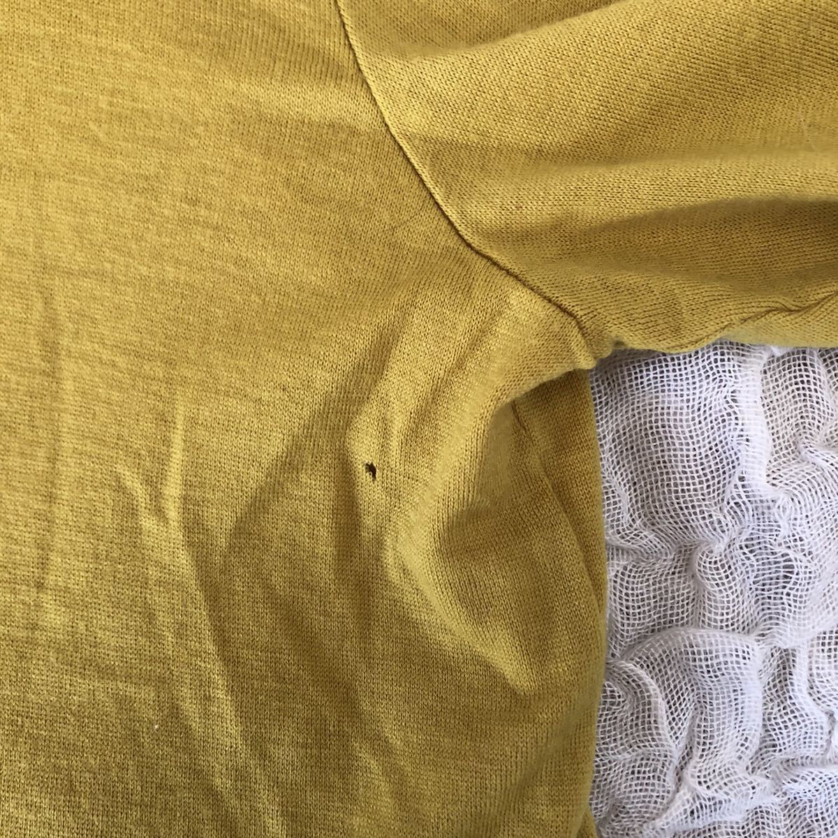 ●前身頃左脇前に穴あき。右裾にヒキツレあり ●後ろ身頃真ん中にヒキツレあり 日本製 トルソーはレディース9号です。 | ||||||||||||
