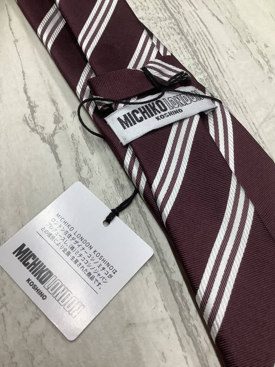 新品 ミチコロンドン 日本製ネクタイ お買い得 エンジ小豆色ベース 白ラインストライプ柄 セッテピエゲ