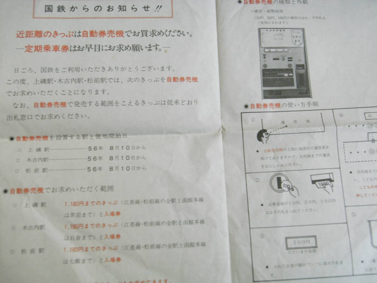 「国鉄からのお知らせ!! 近距離のきっぷは自動券売機でお買い求めください。…」 国鉄チラシ 1981年 上磯駅・木古内駅・松前駅