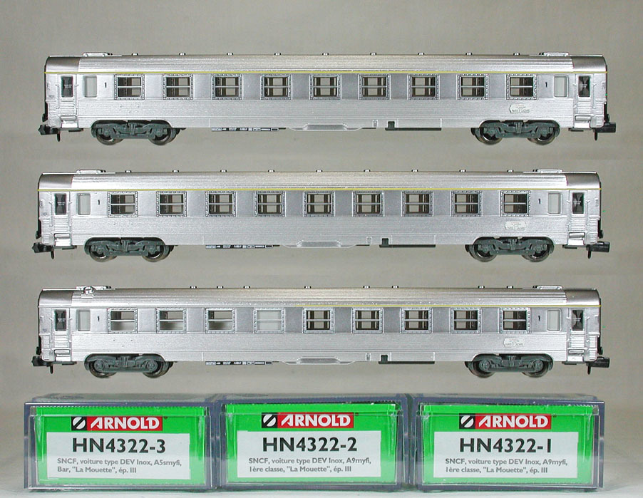 スプレス(Sud-Express)とパリ~ストラスブール間の優等列車に使用され、フランス国内や隣接した国々へと広く活躍しましたが、1990年代までにUIC客車やコラーユ客車に置き換えられて全数が廃車となってます。 このモデルは、ステンレスロングタイプの1等車A9の2輌と1等/バーA5sの3輌でパリのセント・ラザール(Paris St. Lazare)~ル・アーブル(Le Hvrer)間の急行ムエット(La Mouette/カモメ)の装いとなってます。 この商品は、DEV型Inox客車として初めて製品化された車輌です。LSModels社のミストラル69型客車と比較すると少々がっかり出来映えでしょうか。窓下にモールドの歪みがあり、銀色の車体故に気になります。また、窓枠のリベットを表現するための窓枠幅が大きく窓 を小さく見せてます。とはいえ、初めての車種ですので嬉しい製品で最近の中国製のレベルはキープしてます。ただ、中国生産の常でワンロット大量生産のため既にメーカー在庫切れとなってしまってますので、ご興味のある方は早めの入手をお勧めします。なお、バリエーションは今後も 発売予定となってます。 |
