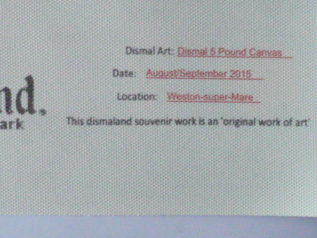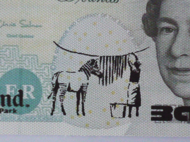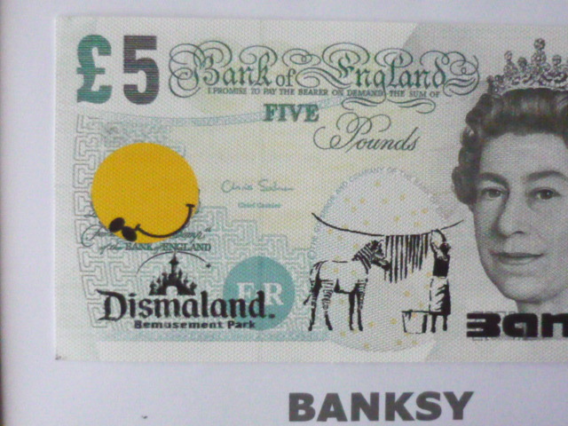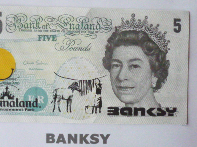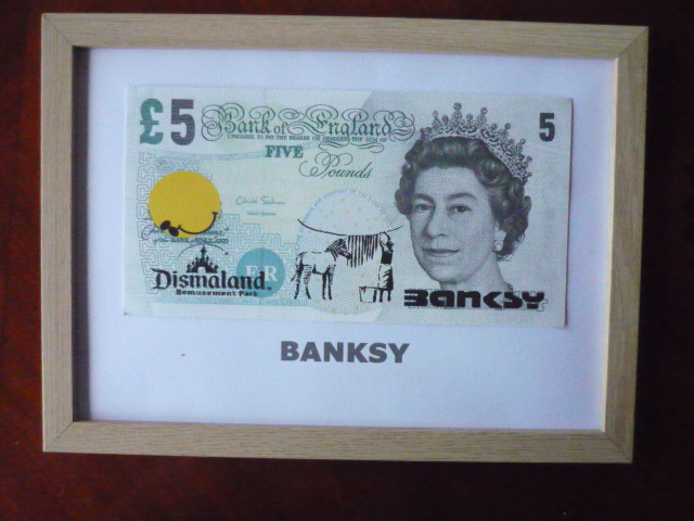 バンクシー Banksy (Banksy Dismaland ) 作品タイトル → ディズマル紙幣 5ポンド 一枚の出品です。 ↓ ※ 5ポンドのサイズ ↓約 約21 cm x 約10.5 cm 厚さ約 1mm ↓ ★出品の作品は、キャンバス生地です。 生地は柔らかい素材で掲載写真は丸まって見えたり、 曲がって見えますが額に入れますと綺麗になります。 ホテル内の倉庫を整理中に偶然見つけた ディズマル紙幣 です。(下記参照) BANKSYサイン入り ★未使用 ★本物保証