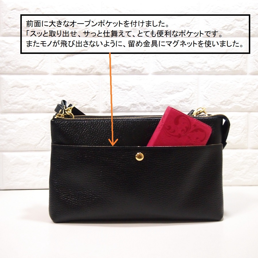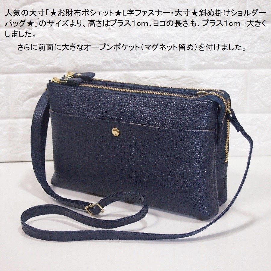 前面に大きなオープンポケットを付け、また人気の大寸「★お財布ポシェット★L字ファスナー・大寸★斜め掛けショルダーバッグ★」のサイズより、高さを+1cm、ヨコの長さもプラス1cm大きくしました。