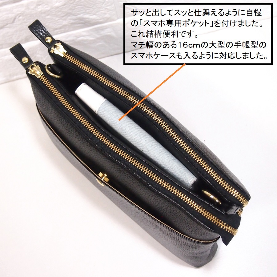 ●大好評のバッグとバッグの間の「スマホ・ポケット」(ポケットの長さ20cm。従来品より+2.5cm)ここに大切なスマホが入ります。これ結構、最高に便利です!。ファスナーを開けずに、スッと取り出せ、サっと仕舞えます。スマホを取り出す際、バッグの中でのスマホの迷子からオサラバできますよ。
