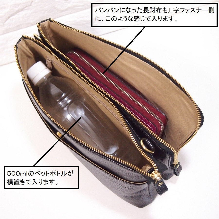 ●L字ファスナーでガバっと大きく開き、出し入れも楽々。実際にお買い上げの方からも、「L字ファスナーがとても使いやすい。長財布もスッポリ収まる。お買い物のときの財布の出し入れのモタツキから解放された。」と多くの評価をいただいております。