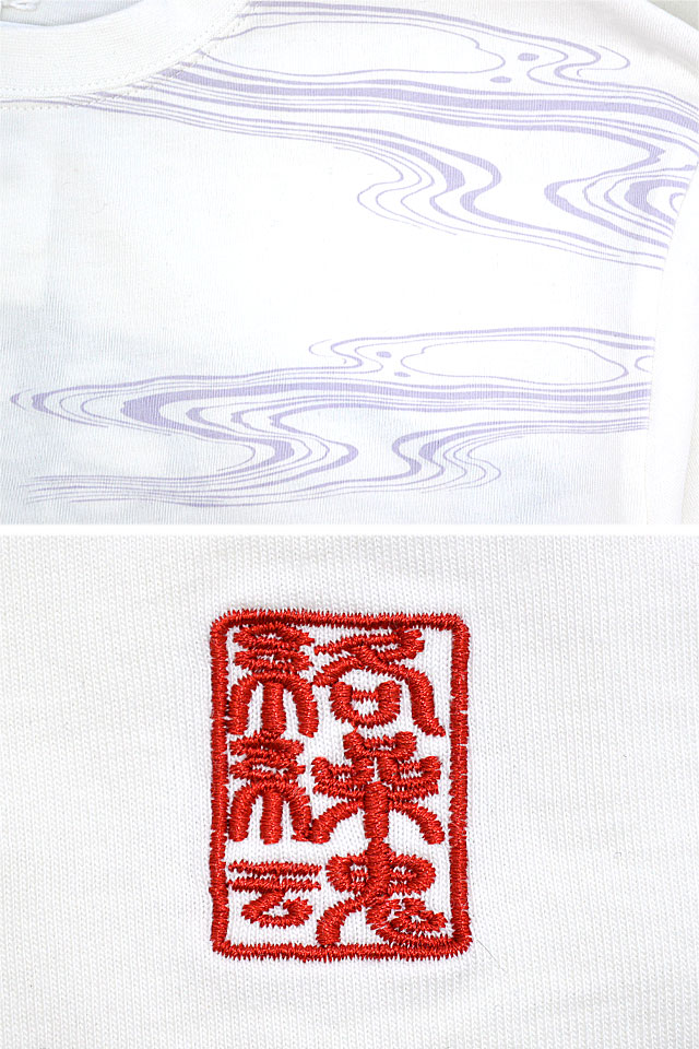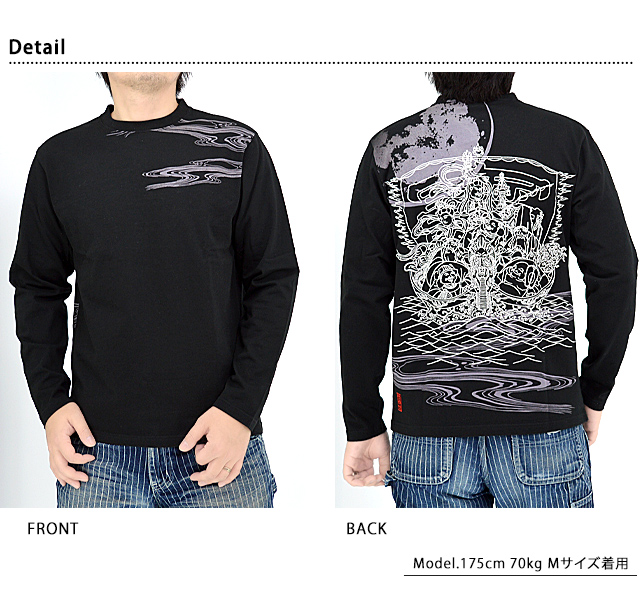 絡繰魂さんから「七福神宝船ロングTシャツ(234118)」のご紹介です。 今回モチーフの主役に採用されたのは、縁起の良い七福神。 背中には宝船に乗り込んだ七福神がアウトラインのみの刺繍で描かれています。 背景の満月はプリントを用いて表現されており、奥行きのある図案に仕上げました。 バック裾にはブランドロゴを印風に刺繍しています。 ボディーには綿100%の刺繍に負けないコシのあるTシャツ生地を採用しています。 | |||||||||||||||||||||||||