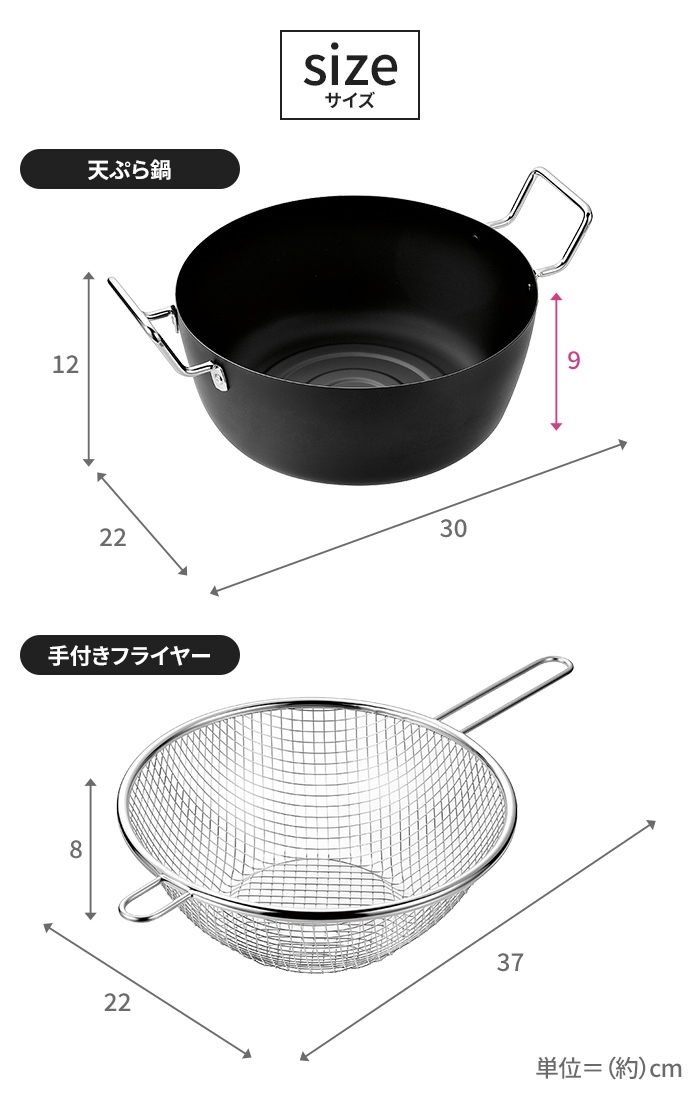 | [天ぷら鍋]約幅22×奥行30×高さ12cm(本体高さ:9cm) [手付きフライヤー]約幅22×奥行37×高さ8cm |