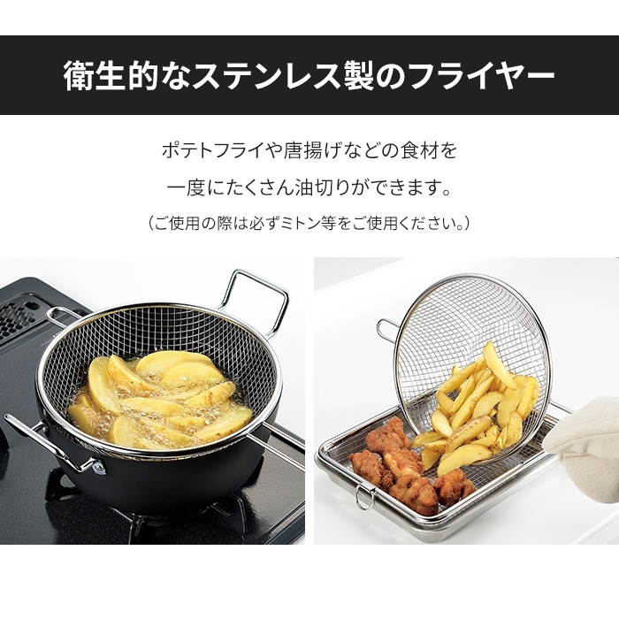 | 大量の揚げ物に便利な天ぷら鍋。 ポテトフライや唐揚げなどの食材を一度にたくさん油切が出来るフライヤー。 |