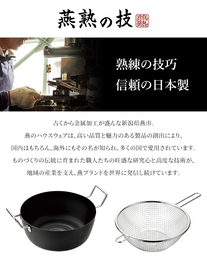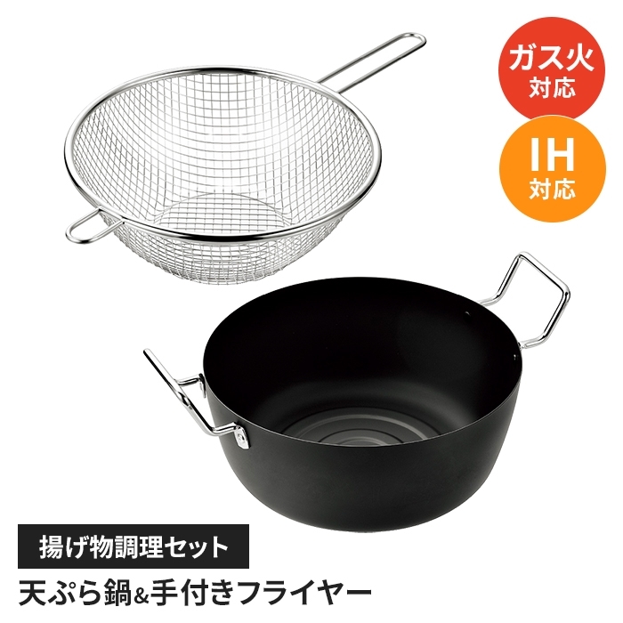 | 天ぷら鍋&手付きフライヤーセット 揚げ物鍋 IH対応 ガス火対応 オール熱源 天ぷら用鍋 油切りザル 調理器具 大容量 深型 便利 国産 日本製 |