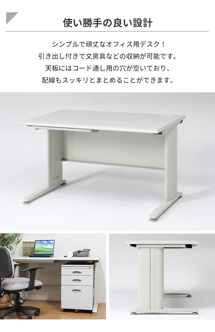 | シンプルで頑丈なオフィス用デスク。 引き出し付きで文房具などの収納が可能です。 天板にはコード通し用の穴が空いており、配線もスッキリとまとめることができます。 |
