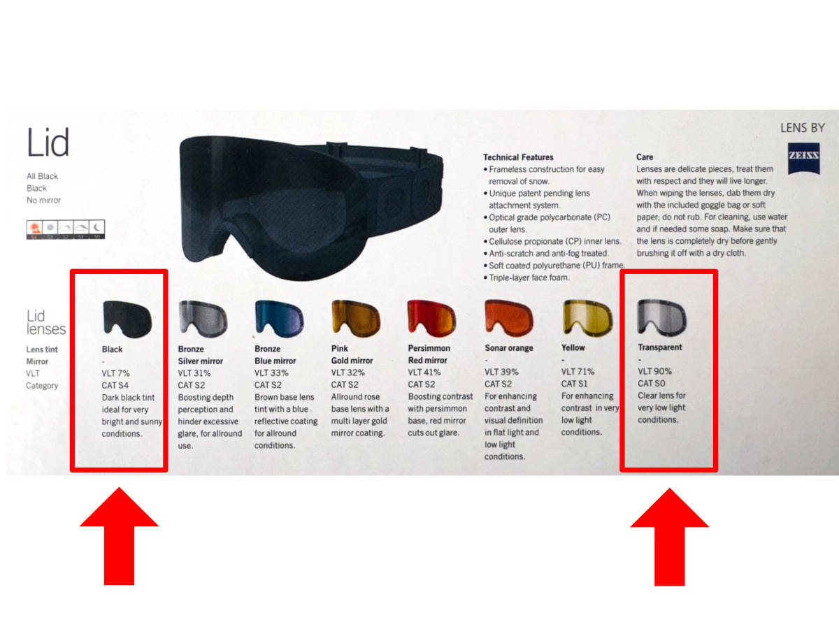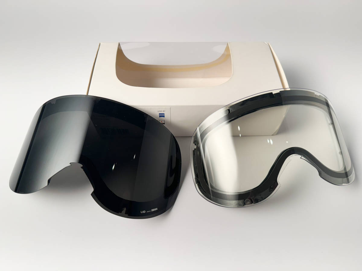 ZEISS製で、それぞれの可視光透過率は、ブラックが7%、クリアが90%です。