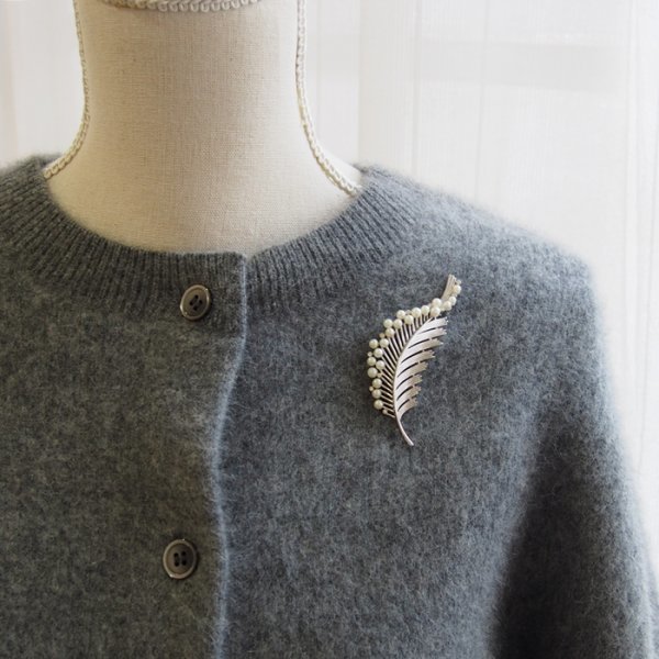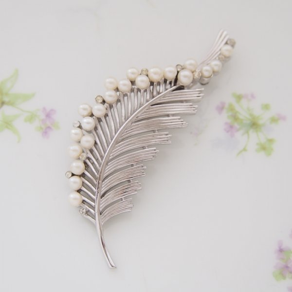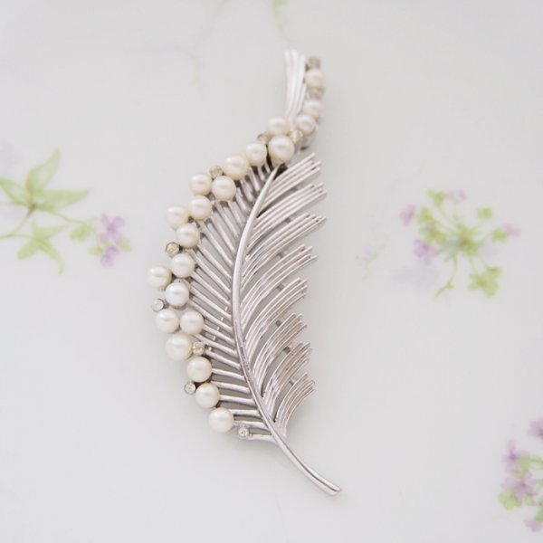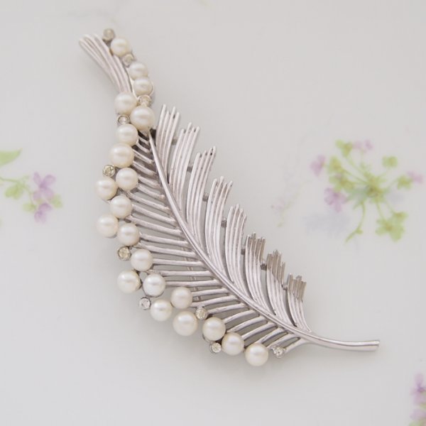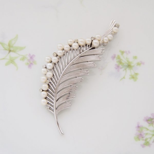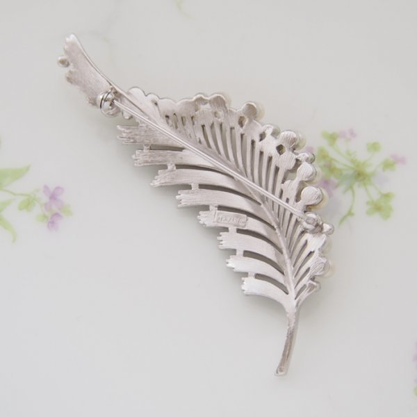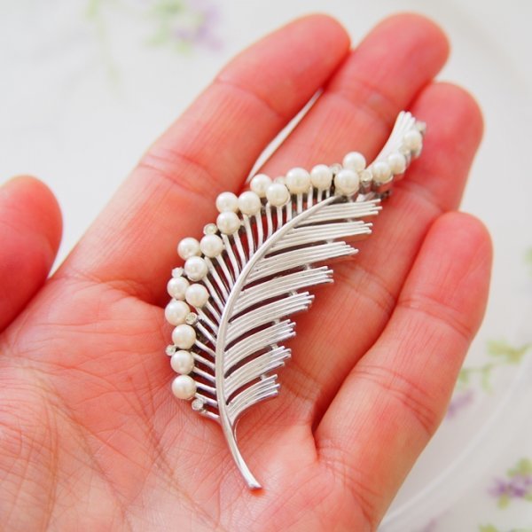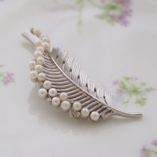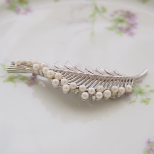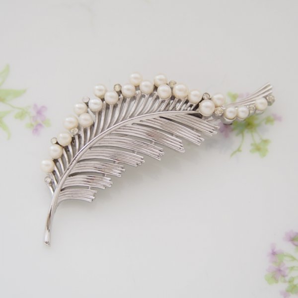 アメリカのコスチュームジュエリーメーカー、Trifariのブローチのご紹介です。 シルバートーンの葉っぱがモチーフのブローチです。 すっきりとした縦長ラインのエレガントなデザイン。 たっぷりのフェイクパールとクリアラインストーンのきらめきがとても素敵です。 経年の為、金属部分やパールに多少の小キズが見られます。 いくつかパールのトーンが異なるものがあるので、リプレイスされたものかと思われます。 ■ブランド: TRIFARI ■刻印: TRIFARI© ■サイズ: 約8㎝ x 約3㎝ ■重量: 約17g アンティーク・ヴィンテージ商品には、経年による傷や劣化などがあります。 目立つものはアイテムの詳細に記載しておりますが、説明以外にもキズや損傷などがある場合がございます。 古いものですので、ご理解いただける方のみご入札下さいませ。 他サイトでも販売しておりますので、同時にご注文があった場合は、品切れの場合もあります。その場合は、大変申し訳ございませんが、ご注文をキャンセルとさせて頂きます事をご了承くださいます様お願いいたします。 | |||