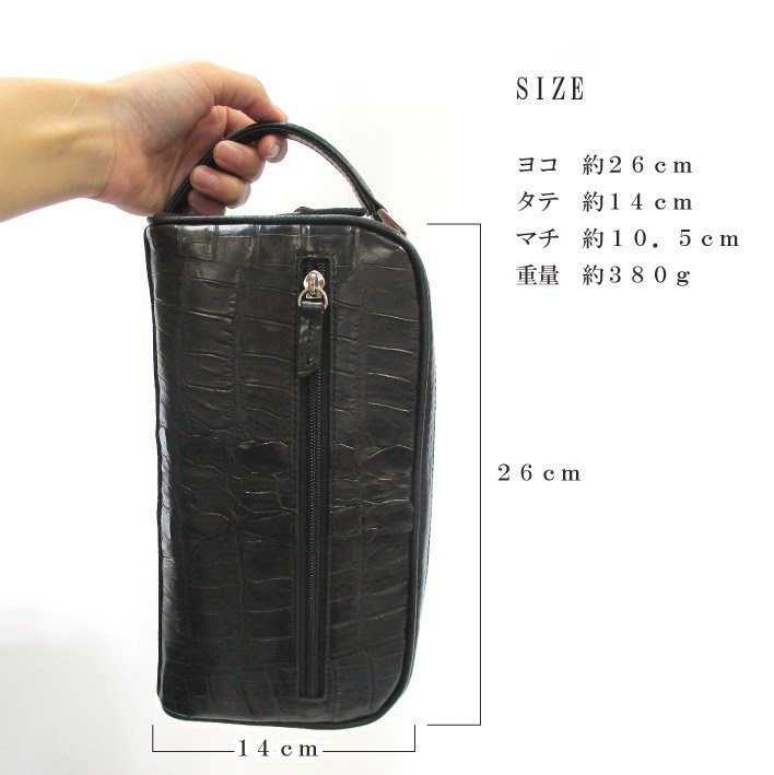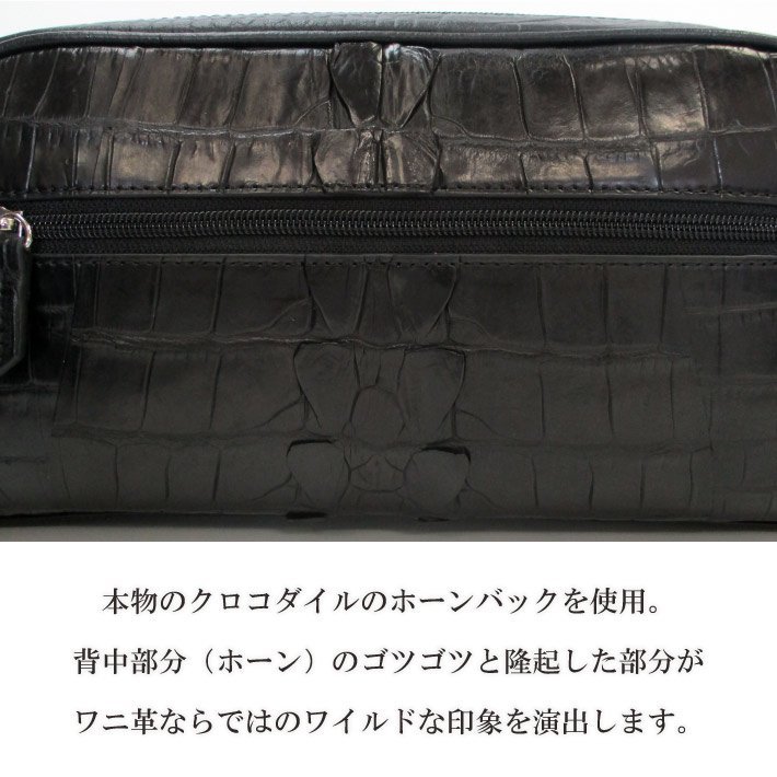 | 高級感あるクロコのホーンバックのセカンドバッグ 本物のクロコダイルのホーンバックを使用しています。 背中部分(ホーン)のゴツゴツと隆起した部分がワニ革ならではのワイルドな印象を演出します。 マット加工を施しており、落ち着いた上品さも兼ね備えています。 メインの収納はファスナー付きで2層に分かれており、収納するものを分類できるので整理がしやすいです。 バッグ自体はコンパクトなのに、割と大きめの小物もスッキリ収まります。 両面両側のファスナー付きフリーポケットはよく使うカード等を入れるのに便利です。 誕生日プレゼント・クリスマス・バレンタイン・父の日・母の日などの贈り物にも最適です。 ワシントン条約゛CITES(サイテス)“の規定に基づいて輸入された養殖のエキゾチックレザーを使用しています。 (CITES(サイテス)は本物の証明として発行されるものです) ※ご注意※ ・天然素材のため1点1点模様が異なります。柄でのお取替えはできませんので予めご了承の上ご購入くださいませ。 ・製造過程や入荷時期のより色合いなどに若干の誤差が生じる場合がございます。 ・商品の仕様、デザインは製品向上の為に予告なしに変更になる場合がございます。 ・ご覧のモニターやブラウザの設定、照明などにより、画像と実物の色合いが若干異なる場合がございます。 以上ご理解とご了承の上、ご購入をお願いいたします。 ■カラー:BLACK ■素材:クロコダイル ■サイズ(約):横26cm×縦14cm×マチ10.5cm ■重量:約380g ■仕様:外側(メインファスナーポケット×2、ファスナーポケット×2)内側(ファスナーポケット×1) --革製品について-- ・製作過程により多少の傷、汚れ、縫い目が粗い、塗装にムラ、接着剤跡等がある場合がございます。 ・天然素材の商品は、自然由来の素材のため革には細かなシワや傷跡・トラ等が存在する場合があります。 ※シワなどは、動物の生育環境や年齢、個体によって異なる、革の特性です。 ・ご覧のモニターやプラウザの設定、照明等により、画像と実物の色合いが、若干異なる場合がございます。 これらについては予めご理解頂いた上でご購入お願いします。 | |