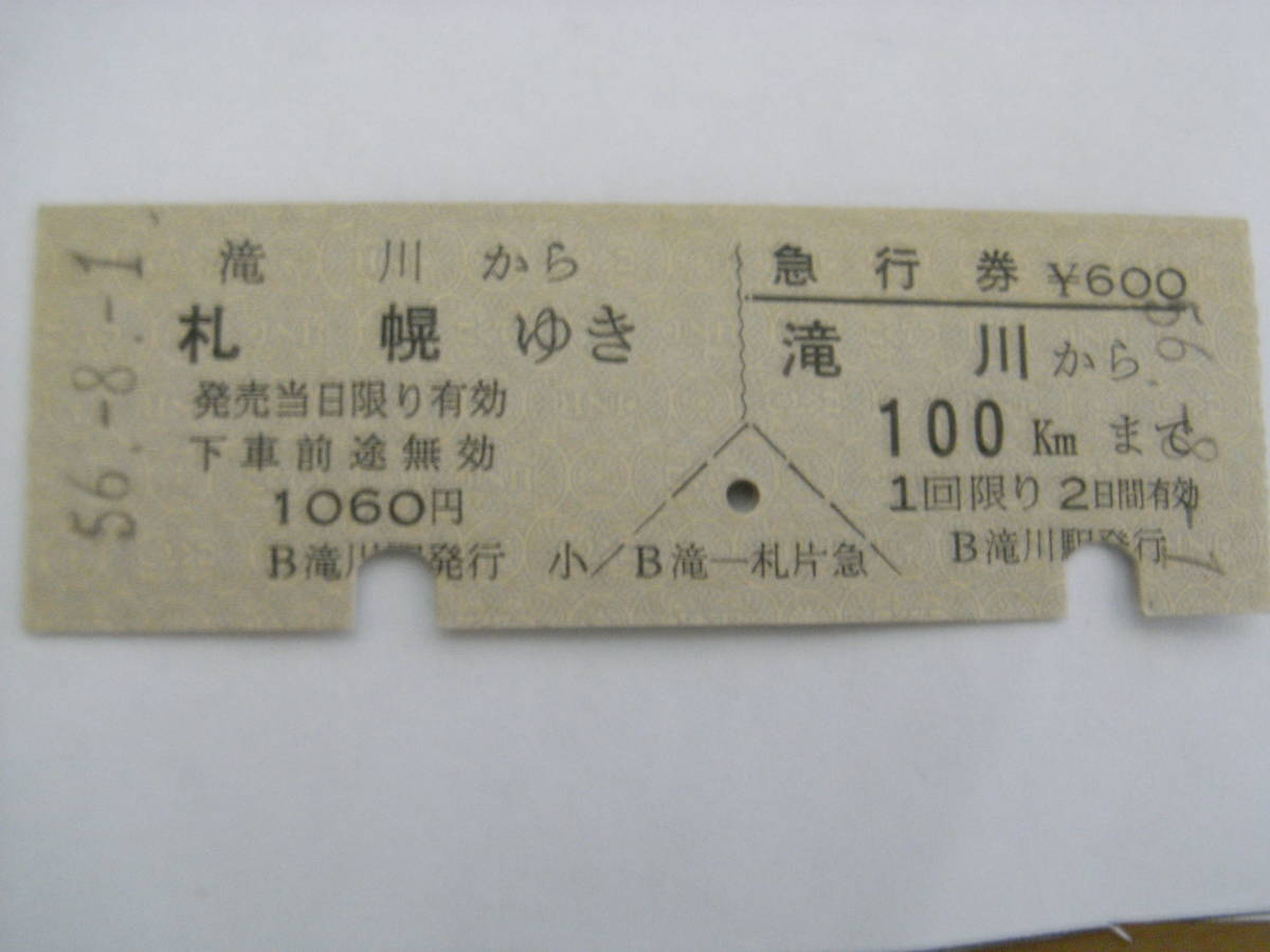 函館本線 滝川から札幌ゆき/急行券 滝川から100kmまで 昭和56年8月1日 滝川駅発行