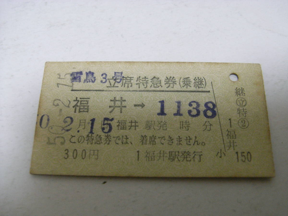 雷鳥3号 立席特急券(乗継) 福井→ 昭和50年2月15日発行 福井駅発行