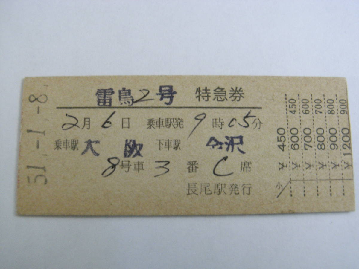 雷鳥2号 特急券 乗車駅 大阪 下車駅 金沢 昭和51年1月8日発行 長尾駅発行