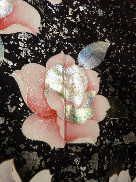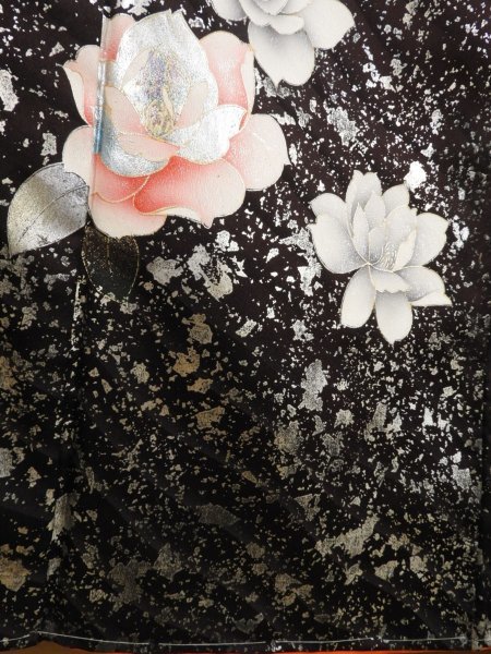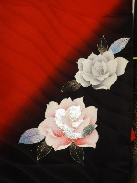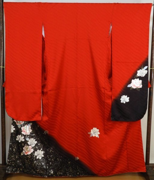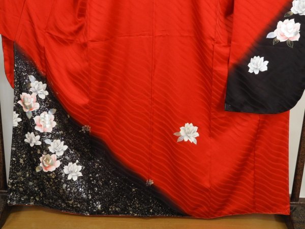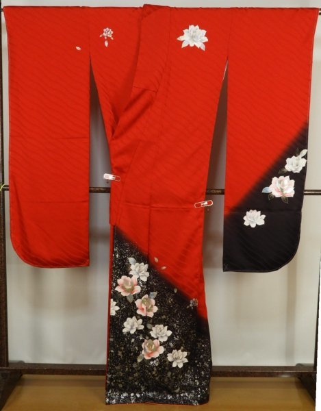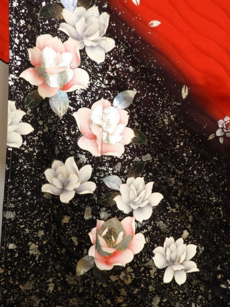 松47 化繊 振袖 赤黒グラデーション地に花 【美品】 身丈167cm ◎◎セール◎◎