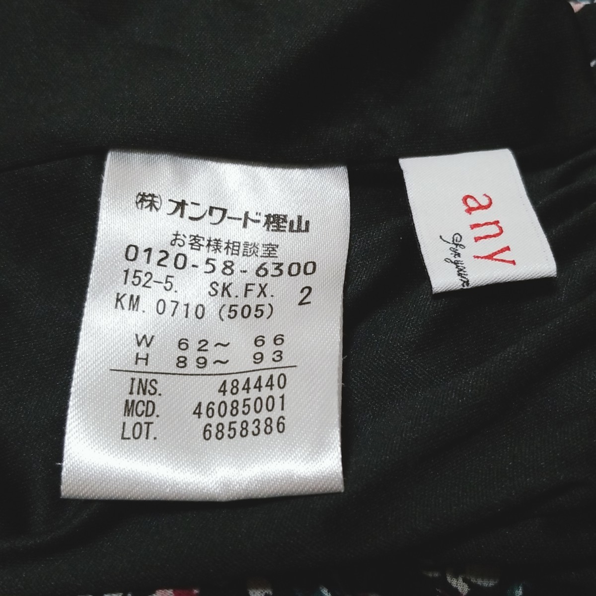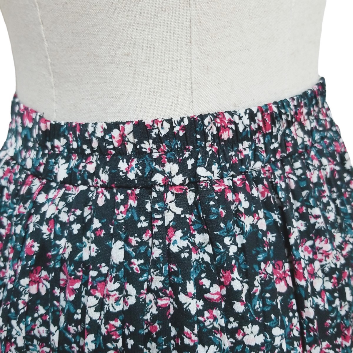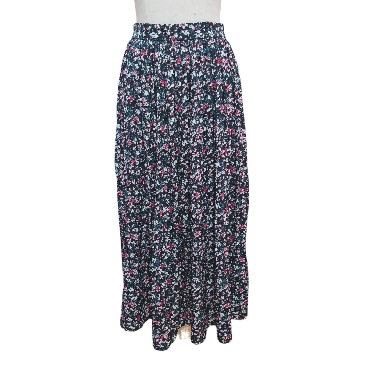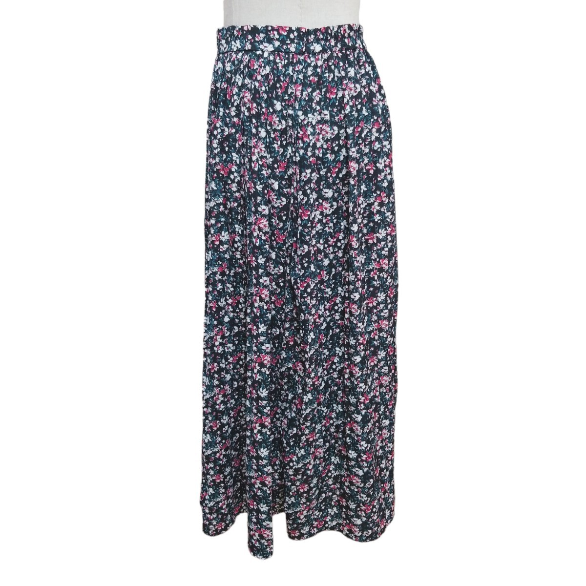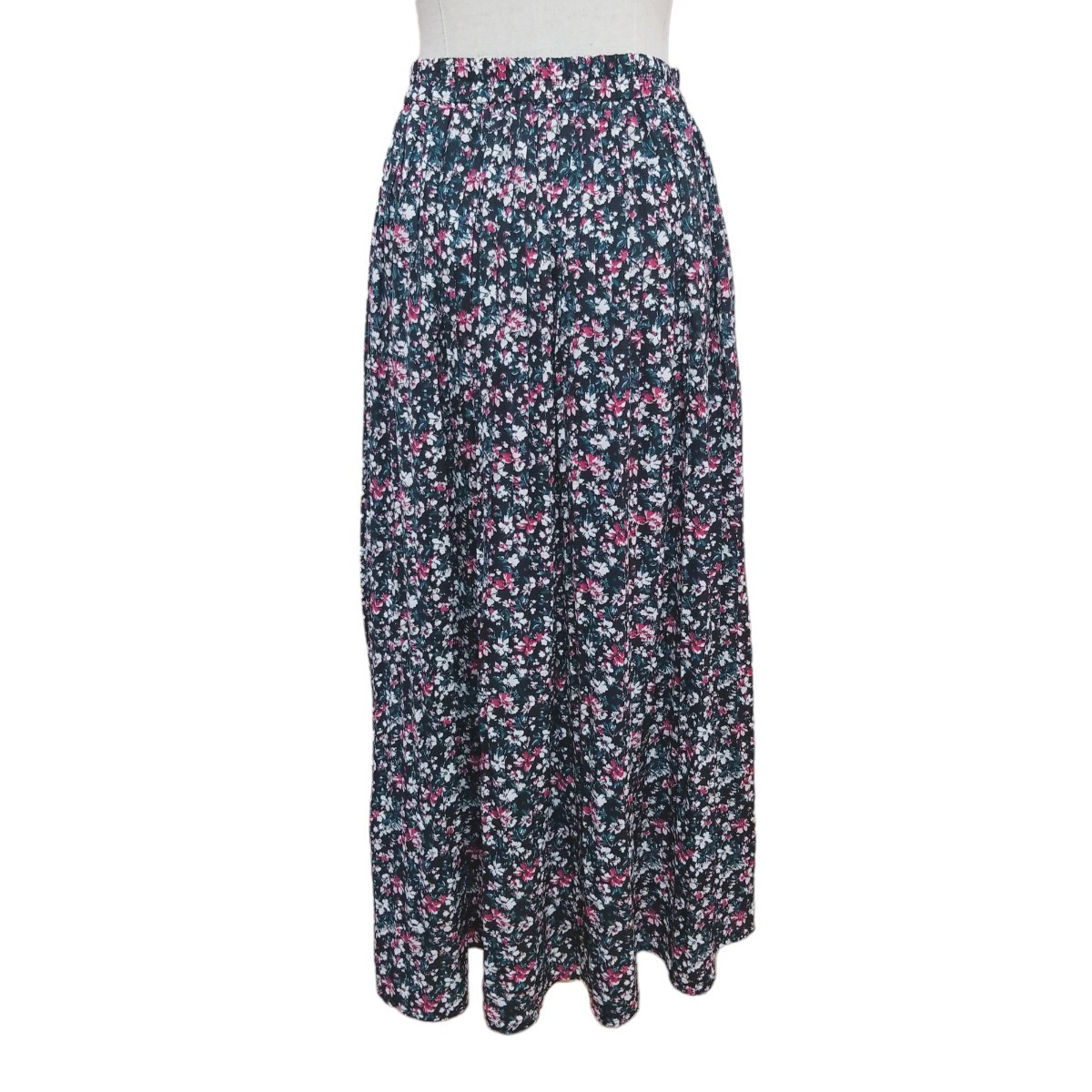 Y909 美品★any FAM エニィファム ロングプリーツスカート フレア レディース M相当 総柄 花柄 プリント 黒 ブラック ウエストゴム