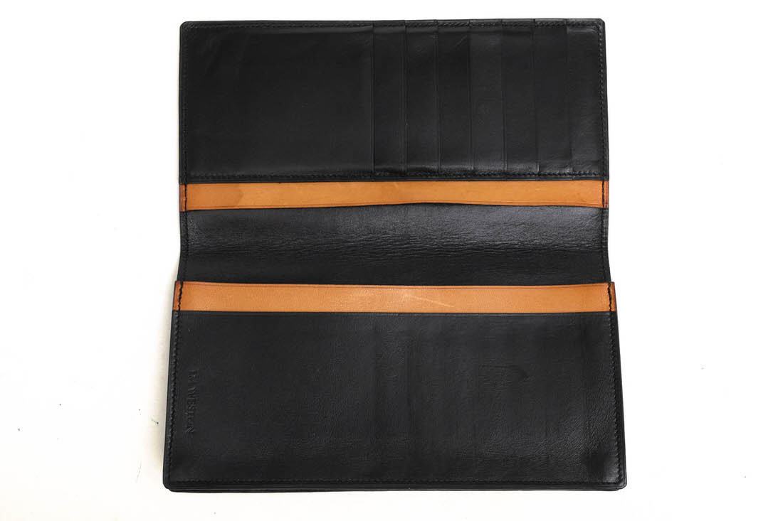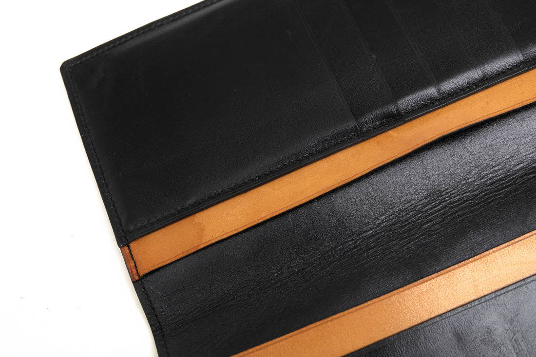 | 欧州ブランドらしく気品のあるロングウォレット。ツヤ感のあるブラックに、ナチュラルなベジタブルタンドカーフの組み合わせがラグジュアリー。ジェイエムウエストンの靴と同じ革を使用しており、ビジネスユースにオススメなデザインです。 |