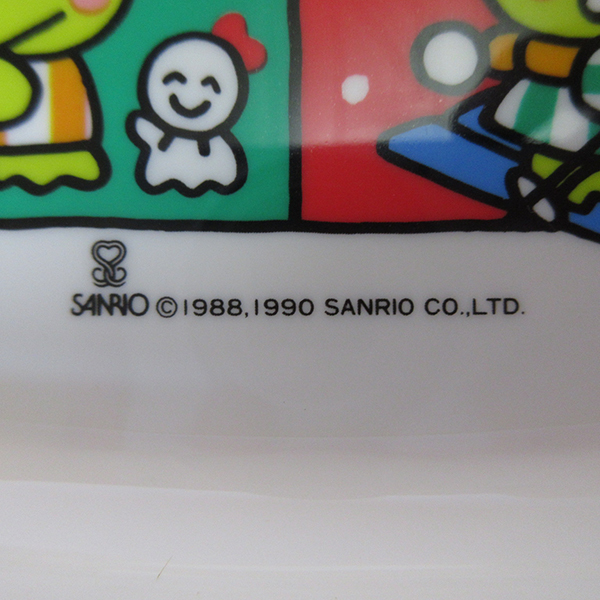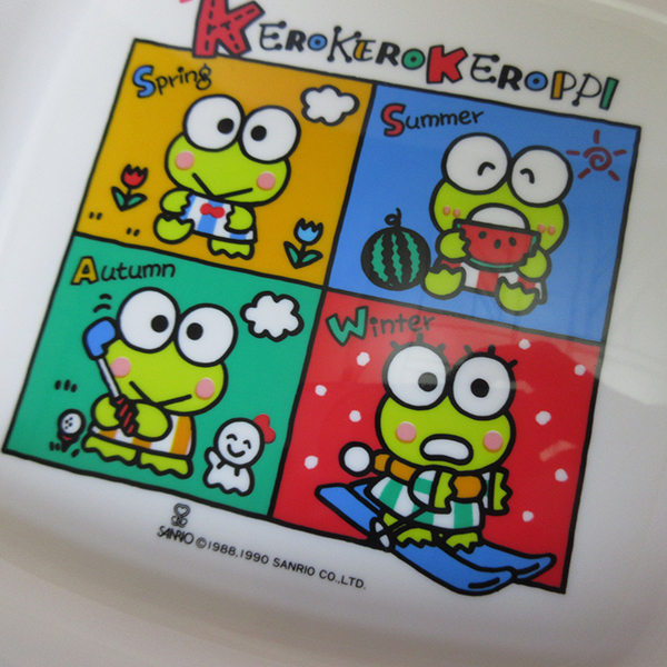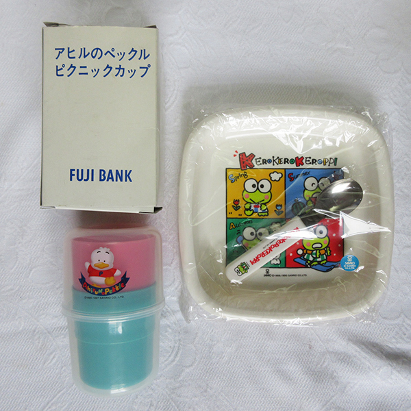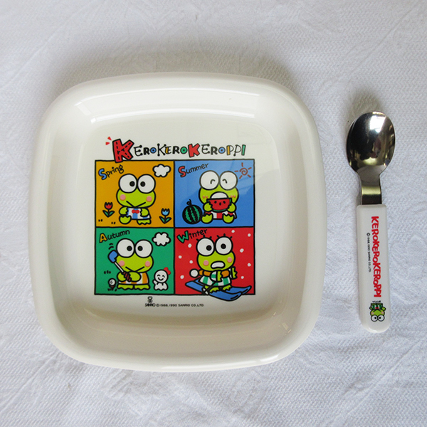●けろけろけろっぴ プレート・スプーンセット/アヒルのペックル ピクニックカップ どちらも25年以上前のヴィンテージ品です。未使用品になります。 実際のご使用はもちろん、コレクションにいかがでしょうか。 ※バラ売り不可 ----------------------------------------------------------------- ●けろけろけろっぴ プレート・スプーンセット 1990年製のけろけろけろっぴトレイ・スプーンセットです。未使用。 ●サイズ:プレート 18×18cm/スプーン 13.5cm ※素人採寸になりますので、多少の誤差はお許しください。 ----------------------------------------------------------------- ●アヒルのペックル ピクニックカップ 97年製のアヒルのペックル ピクニックカップです。未使用。 実際のご使用はもちろん、コレクションにいかがでしょうか。 未使用品ですが、保管時・製造工程でについたスレがあります。 割れ・ヒビ等はありません。 ●サイズ:カップ Φ6.5×7cm/ケース Φ7.5×12cm ※素人採寸になりますので、多少の誤差はお許しください。 -----------------------------------------------------------------
