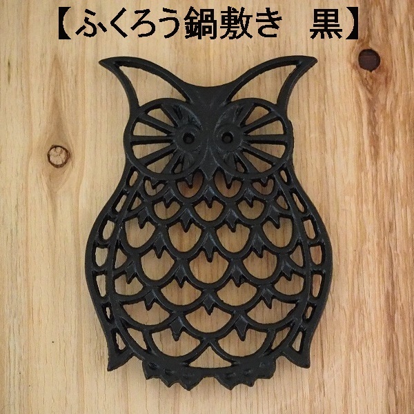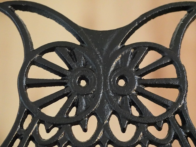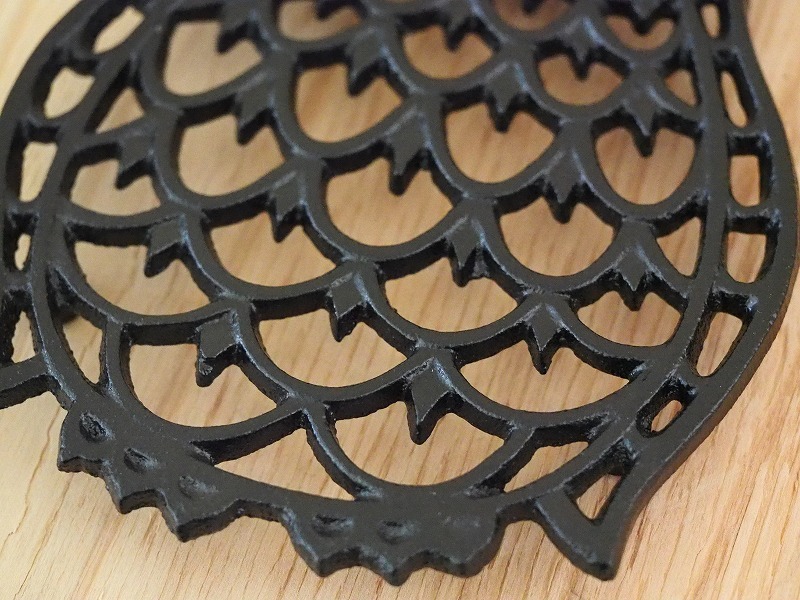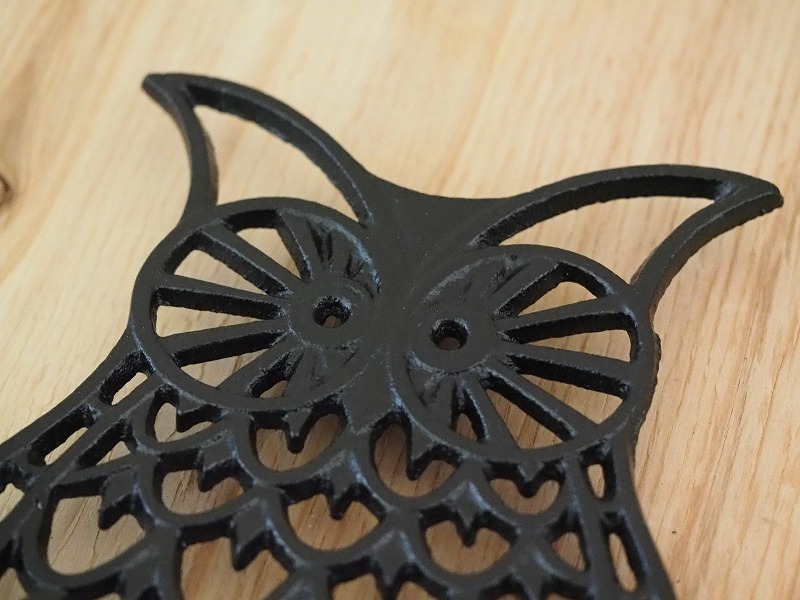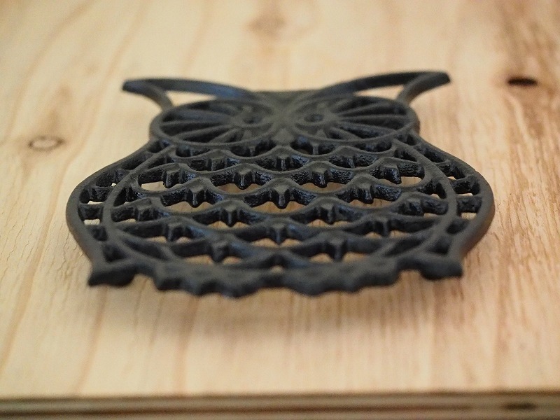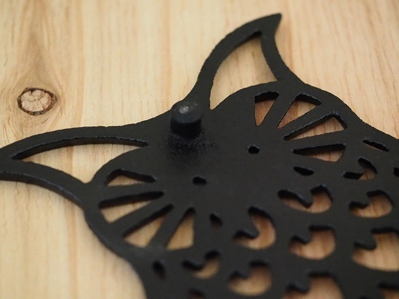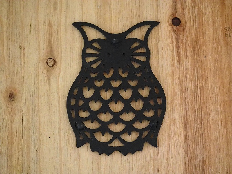 【ふくろう】 家の守り神の効果もあります。 夜行性なので、夜の番人ともなっていますし、先見の明があるともされています。「福来郎」「不苦労」などどいった縁起のよい吉祥な当て字が充てられ、「福が来る」「苦労がない」などを願った縁起物として愛されています。 アウトドアに持って行ったり、ガーデニングで植物の下にひいたり スキレット鍋と合わせて食卓に出しても可愛いです。 程よい重厚感で、穴がたくさんあるので壁に飾ってインテリアにしても素敵です。 サイズ(約) 幅14.5cm 高さ20cm 厚み1.7cm 重さ(約) 440g前後 ※脚の裏にゴムパッキンがついてますので、テーブルを傷つけません。 ※写真と同等品を発送いたします。多少個体差がございます。