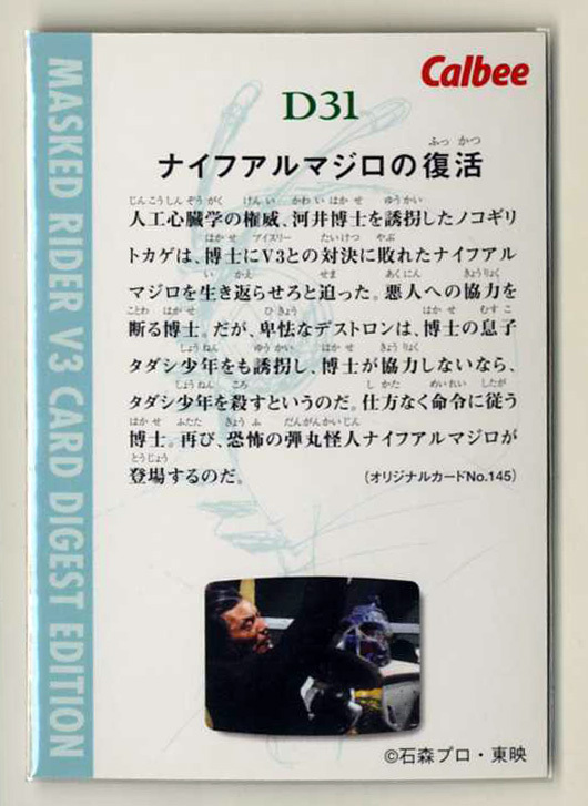 | ◆防水対策 厚紙補強 カルビー 仮面ライダーV3チップスカード(2004 復刻版) D31 ナイフアルマジロの復活 トレカ 即決 | |