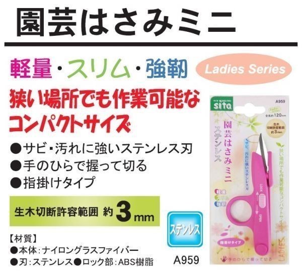 | 軽量・スリム・強靭 狭い場所でも作業可能なコンパクトサイズ サビ・汚れに強いステンレス刃。手のひらで握って切る指掛けタイプ 【サイズ】全長:120mm 刃先:25mm ●重量:約31g 【材質】●本体:ナイロングラスファイバー ●刃:ステンレス ●ロック部:ABS樹脂 生木切断許容範囲:約3mm |