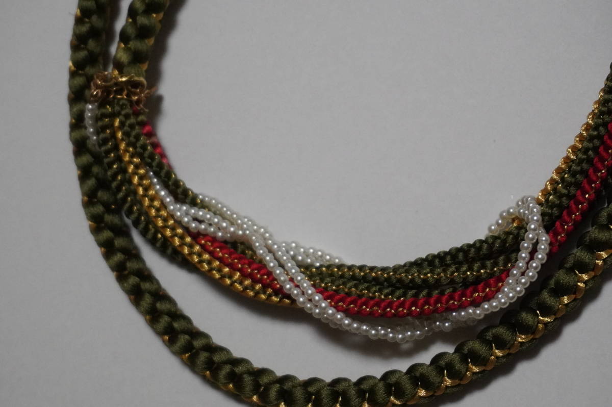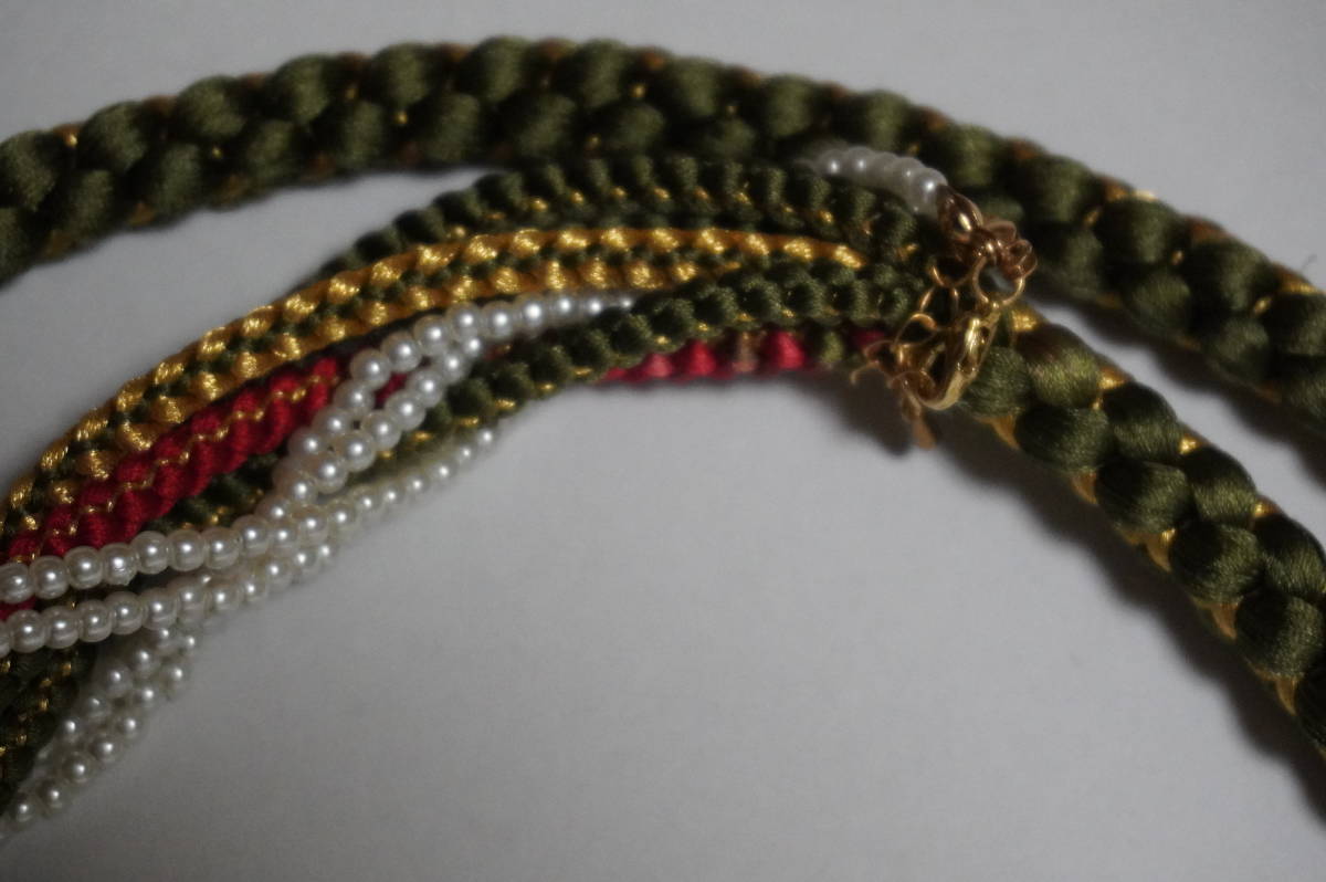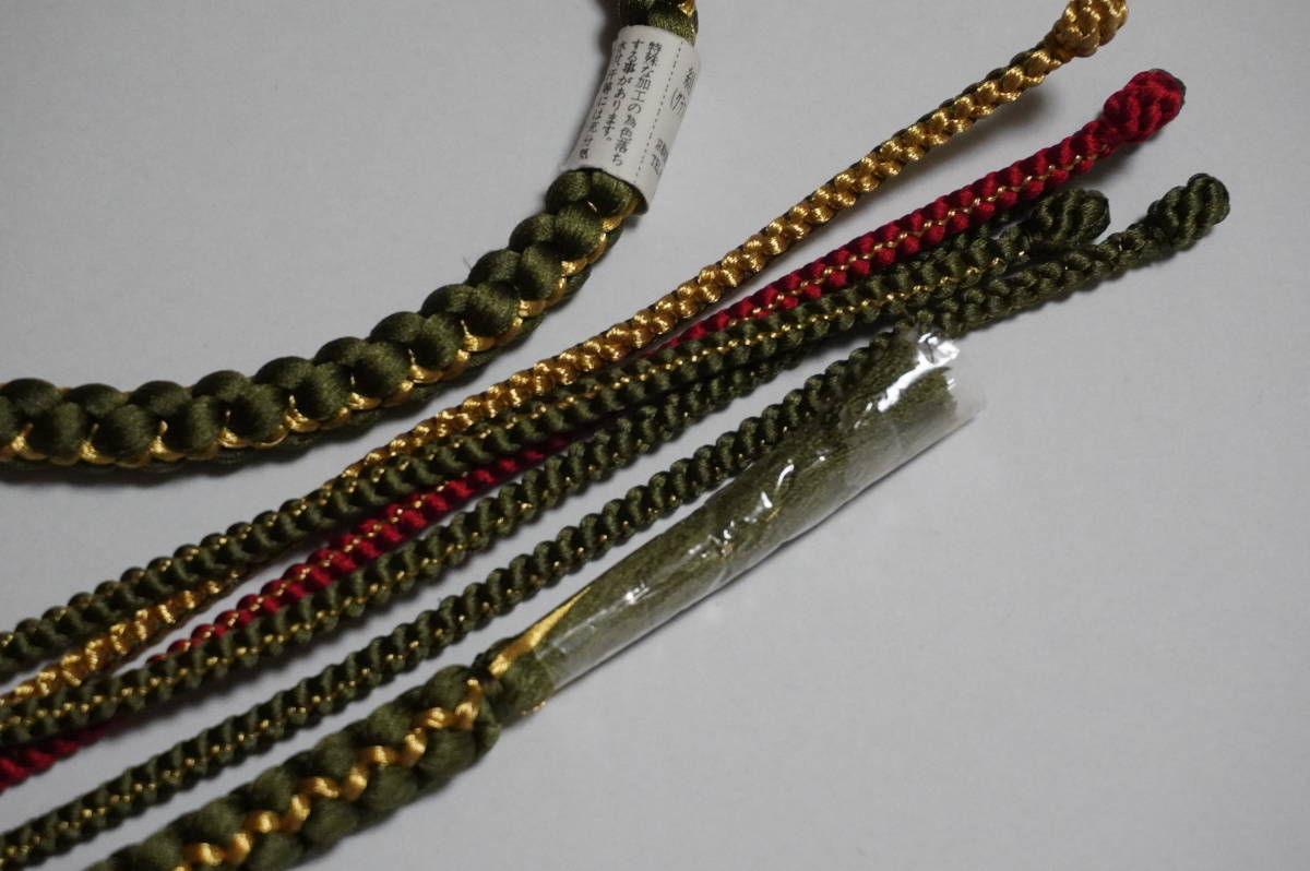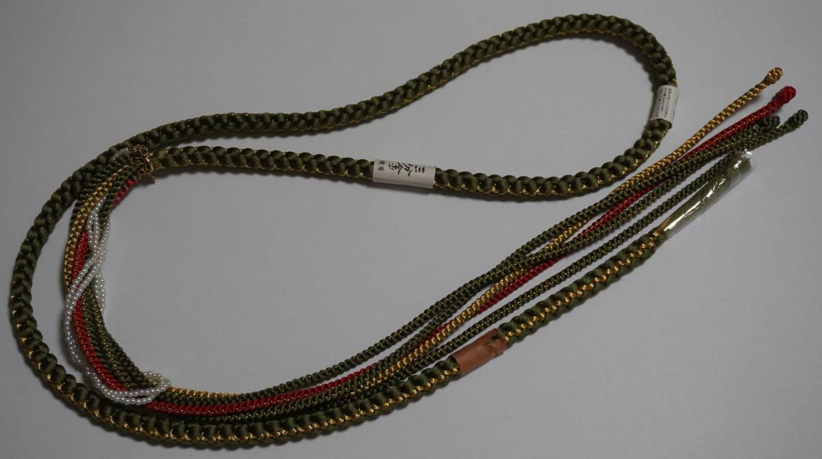 (特価)飾りつき丸帯締め 絹100%(含、金属糸使用) 飾りつき丸帯め。新品処分品 渋抹茶色 金色糸の編みこみアリ)で途中から5本分かれ、飾り玉つき(モニターにより、濃く、または薄くっている場合などありますので心配なかたは質問をしてください)。 巾約10mm 。長さ房を入れないで約155cm(M寸表示)