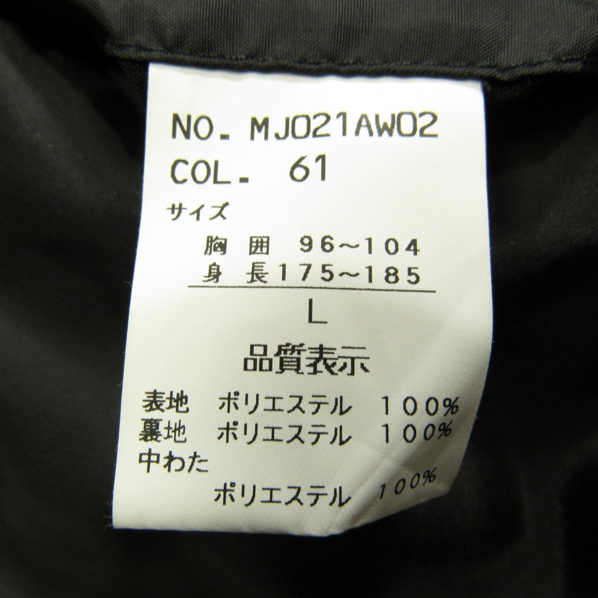 | 表記サイズ L 胸囲96~104 身長175~185 実寸サイズ(cm) 身幅/56 肩幅/47.5 着丈/74.5 袖丈/63 ゆき丈/87 1番細い位置の胴幅/53.5 |