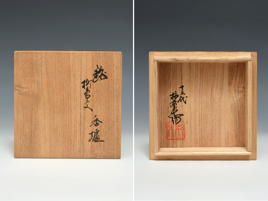 十三代 柿右衛門 錦柳鳥文香爐です。 柿右衛門作品ならではの艶やかな肌に、洒脱な色使いで柳と鳥が描かれています。 高台内に「柿右衛門」の銘が染め付けられています。 ※撮影の際に生じた写り込みなどがございます。 ご理解の程よろしくお願い致します。 |
