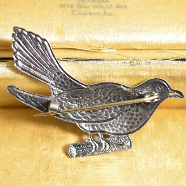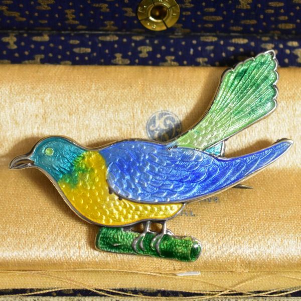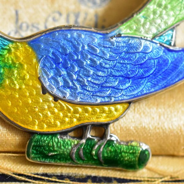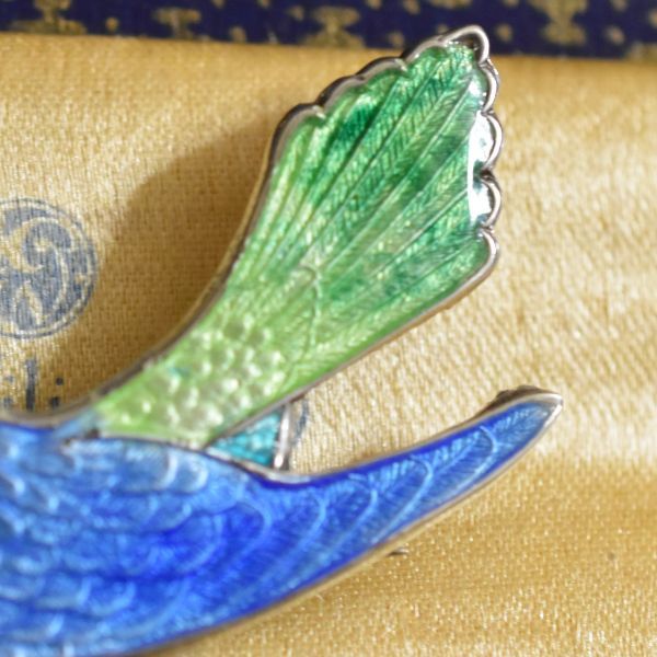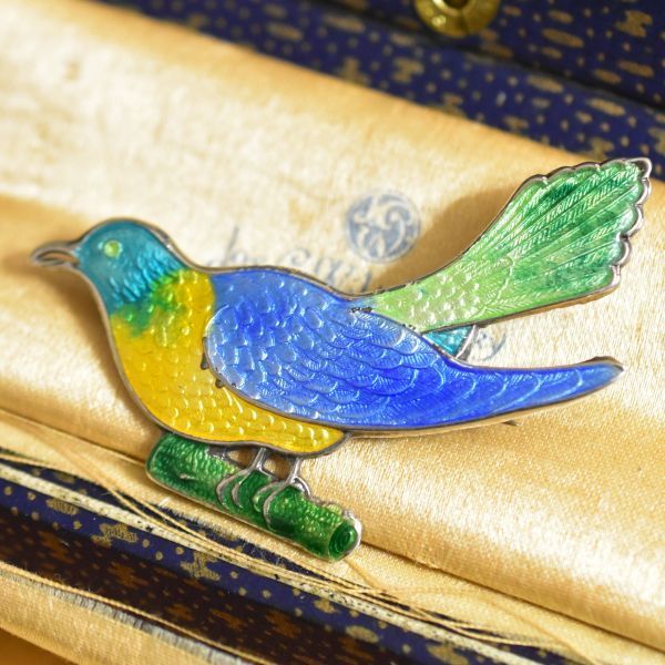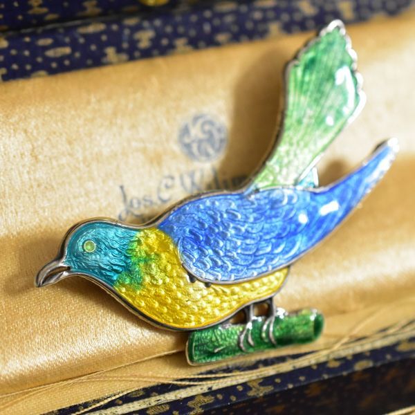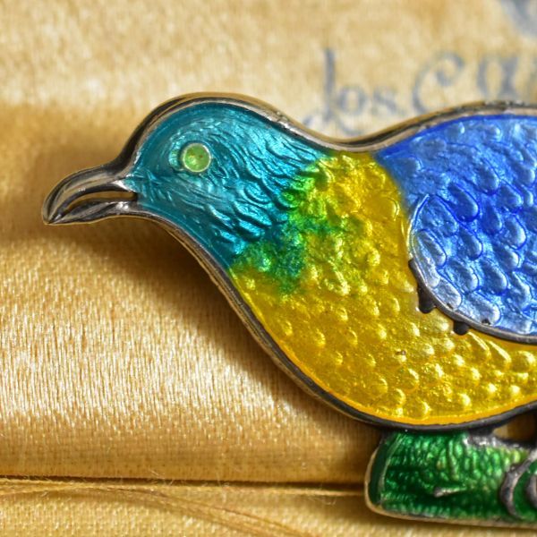アンティーク 純銀製/Silver/シルバー 手描き エナメル/七宝の青い小鳥/バードのブローチ 大きめ 本物保証