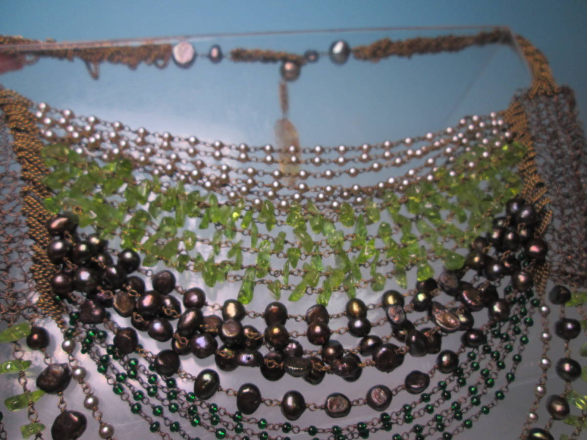 本真珠、ブラック淡水真珠。ペリドットにビーズを繋ぎ中央に水晶を飾ったゴージャスなデザインネックレスです。