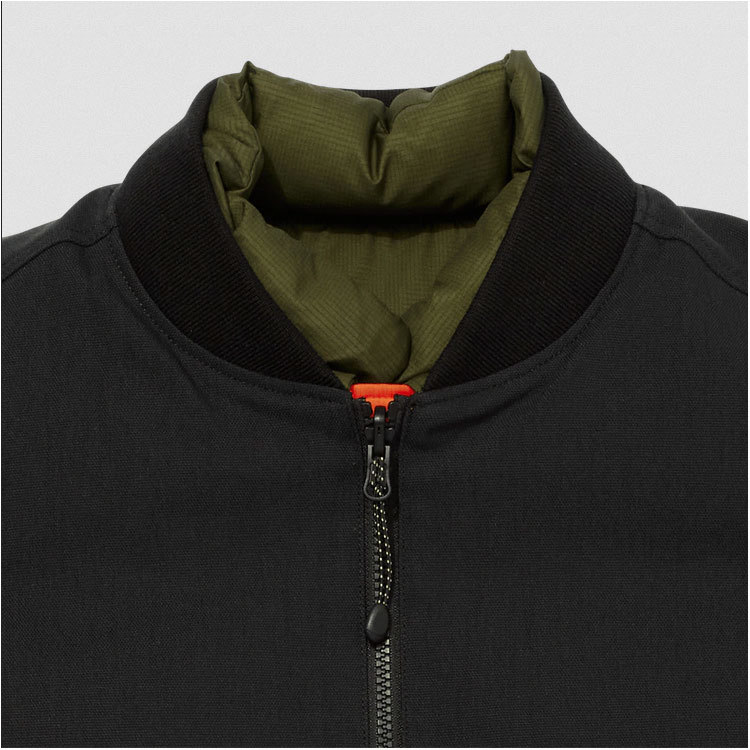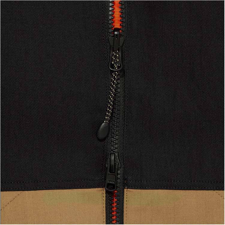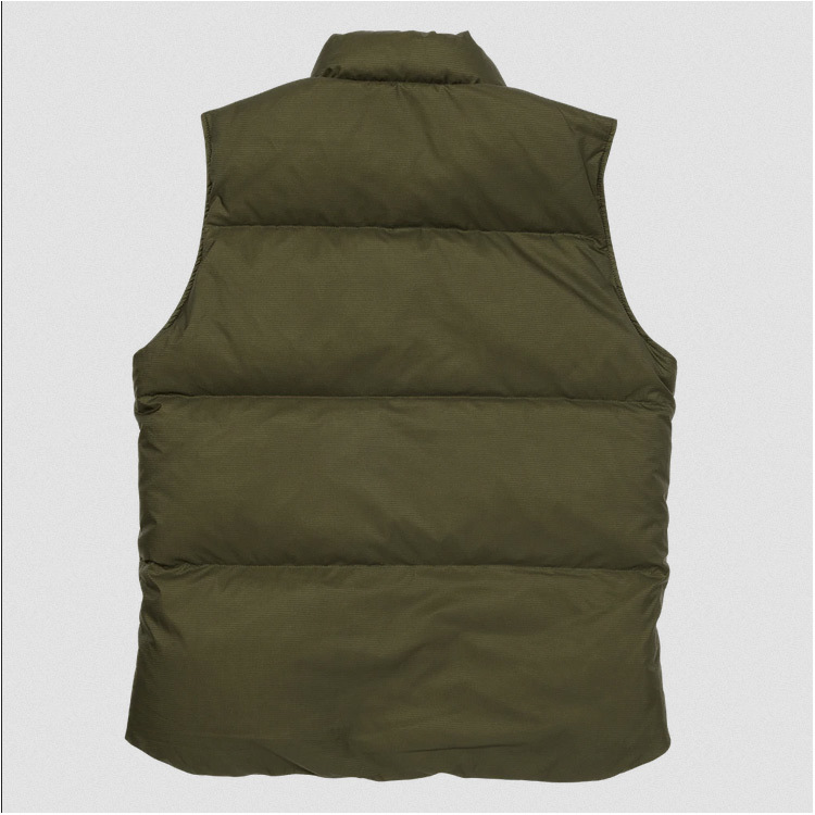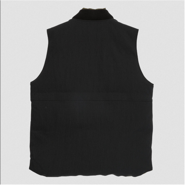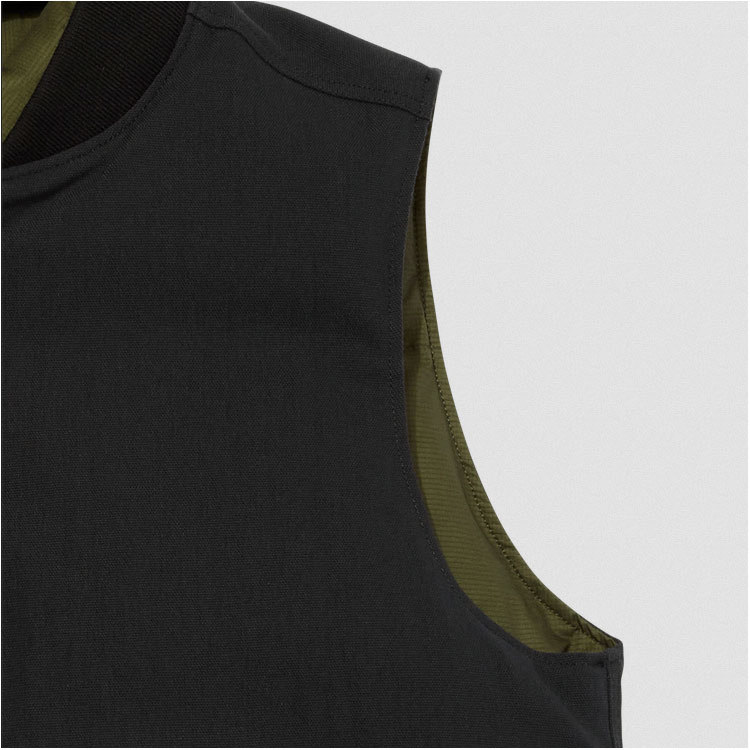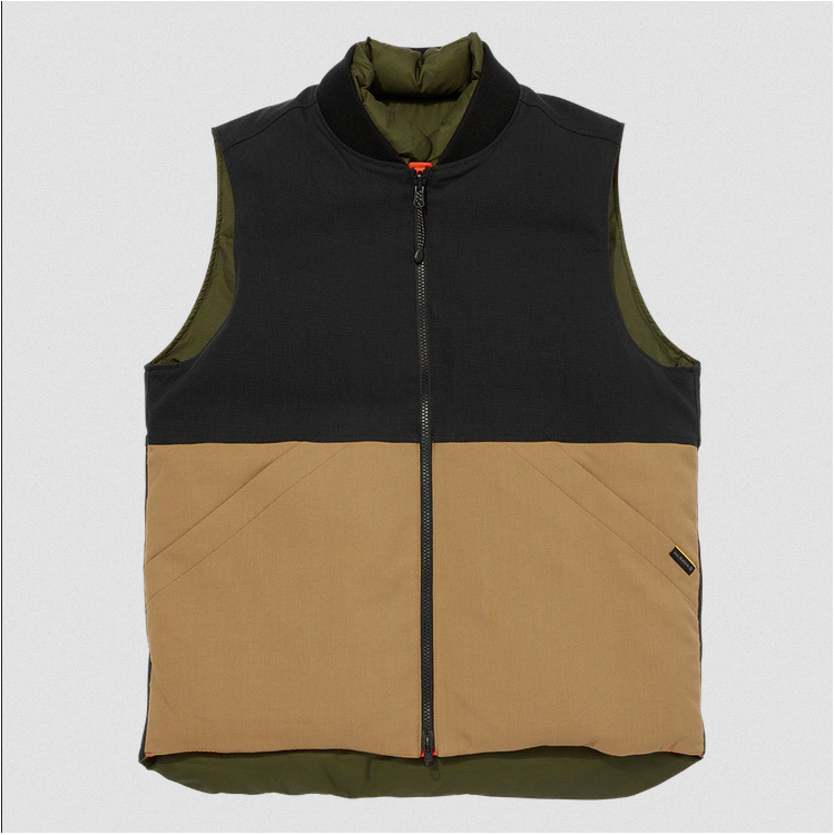 東レ開発難燃素材【ナフレムR】を前身頃のボトムパネルに配した焚き火仕様面と、撥水性を備えたストレッチリップストップ素材面。ヘリテージなワークベストとレトロダウンベストという異なるコンセプトを表裏でハイブリッドした、コンビネーションデザインのリバーシブル仕様。インサレーションには700FPのダウンをふんだんに充填した、保温性にも抜かりのない1枚です。