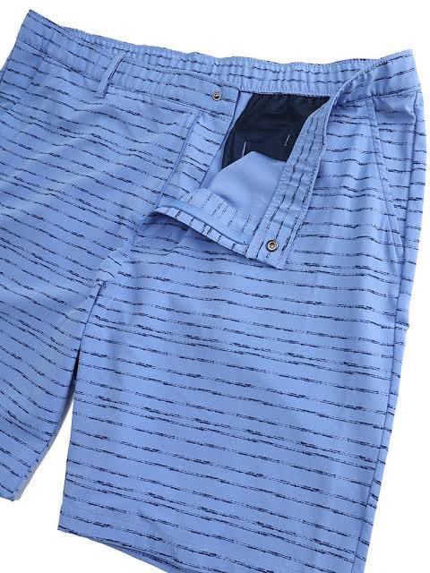 adidasのボーダー ショートパンツ TEXTURED 9 INCH GOLF SHORT。通気性と伸縮性のある生地で作られており、快適な穿き心地がボールショットの邪魔をしません。上部はルーズフィット、膝はスリムフィットでずれないつくり。一部、リサイクル素材を使用している環境を考えたアイテムなのもポイント。