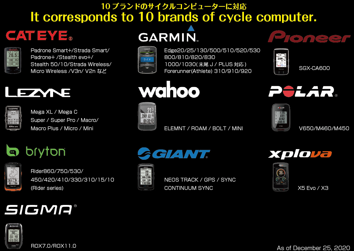 ・ブライトン:Rider 530/410/310/15/ 10・レザインMega XL / Mega C /Super/Macro/Micro/Mini・ワフー:ELEMNT/BOLT/MINI・パイオニア:SGX-CA600・ジャイアントNEOS TRACK /NEOS GPS /NEOS SYNC・ポラール:V650/M460・エクスプローバ:X5 Evo / X3・シグマ:ROX7.0/ROX11.0にも対応