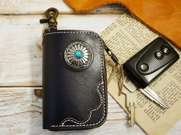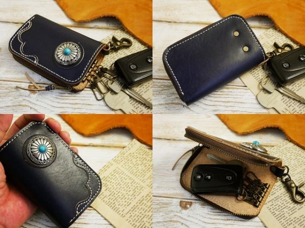 送料無料 コロンと!!ハーフジッパー レザーキーケース ハンドメイド 姫路レザー ターコイズコンチョ スマートキー lkc28 手染めネイビー