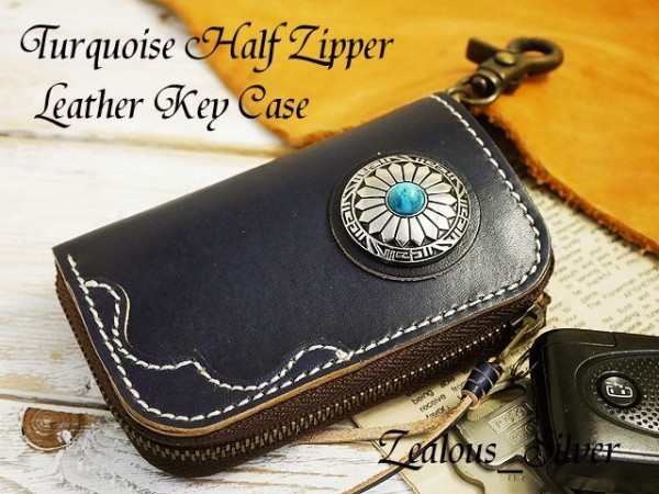 コロンとフォルム!!ハーフジッパー レザーキーケース ハンドメイド 姫路レザー ターコイズコンチョ スマートキ- lkc28