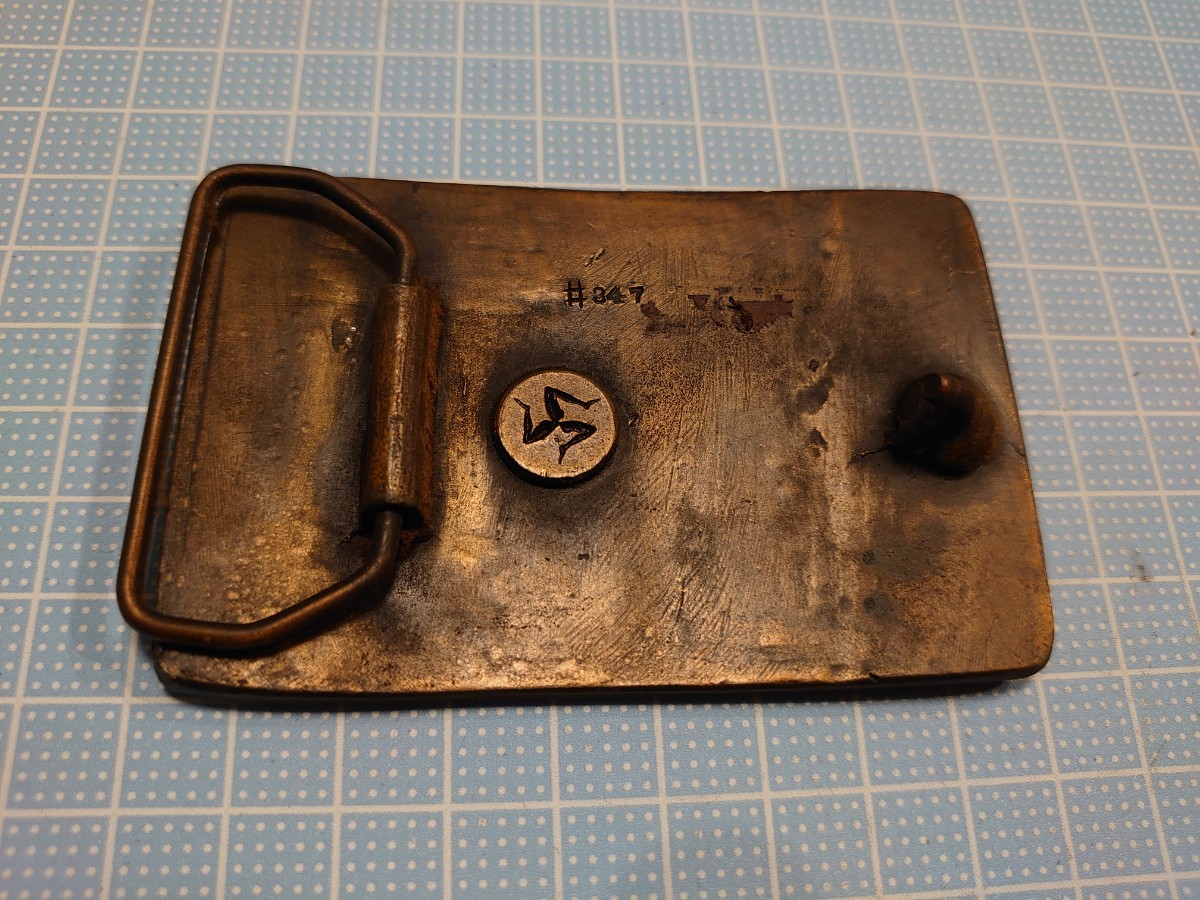 素晴らしい本場米国製のビンテージベルトバックルです。かなり古いものでそれなりの変色や小傷などがございます。色は写真が実物と異なって見える場合もあるようです。こちらは古い5円玉のような濃い銅色系のベースです。苦情返品なしでお願いいたします。ベルト巾45ミリくらいまでです。176gほど。