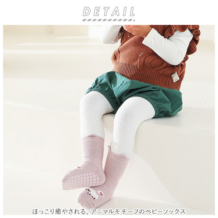 | 商品説明 | ・・ほっこり癒やされる、アニマルモチーフのベビーソックス。 ・ぴょこんと可愛い耳付きで可愛さアップ♪ ・肌馴染みの良い生地感◎伸縮性もあり、赤ちゃんの足に心地よくフィット! ・履き口とくるぶしに当たる部分はリブ素材で、脱げにくいのもポイント。 ・底面に安心の滑り止め付き。 ・デイリー使いにぴったり!デザイン違いで揃えるのもおすすめ。 |