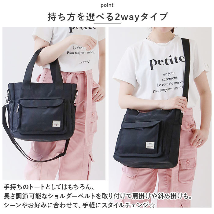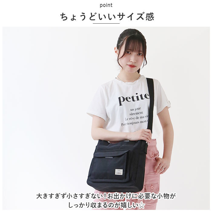 | 商品説明 | ・・すっきり収納できる♪デイリー使いにぴったりな「CIARA 2WAYショルダーバッグ」が新登場。 ・【ちょうどいいサイズ感】 ・大きすぎず小さすぎない!お出かけに必要な小物がしっかり収まるのが嬉しい☆ ・【持ち方を選べる2wayタイプ】 ・手持ちのトートとしてはもちろん、長さ調節可能なショルダーベルトを取り付けて肩掛けや斜め掛けも。シーンやお好みに合わせて、手軽にスタイルチェンジ☆ ・【天ファスナー開口】 ・開口部は天ファスナー式。中身がこぼれ落ちにくく、プライバシーを確保。 ・【A4サイズ対応、小物がひとまとめ!】 ・内側はA4サイズのファイルが横向きにぴったり。ipadや500mlペットボトル、ポーチなども収まるサイズ感。裏地は汚れが目立ちにくいブラックカラー。 ・【小物が迷子になりにくい!】 ・内側・外側合わせて5つのポケットを装備。使用頻度の高い物や衛生用品などを整理整頓できて、必要な時にすぐに取り出せるのがポイント。 ・【使い勝手抜群のナイロン製】 ・軽くて丈夫なナイロン素材を採用。衝撃に強くはっ水性もあるので、汚れや水滴もサッと拭き取るだけ!気にせずガシガシ使えちゃう!(※完全防水ではありません。濡れた状態で放置しないでください。) ・【様々なシーンで】 ・シンプルながらこだわりの詰まった仕様で、通勤・通学、マザーズバッグなどとしても活躍◎いつでも気軽に持ち出せる万能アイテム! ・【ポケット仕様】 ・内側:ファスナーポケット×1、オープンポケット×1 ・前面:ファスナーポケット×1、面ファスナー式フラップポケット×1 ・背面:ファスナーポケット×1 |