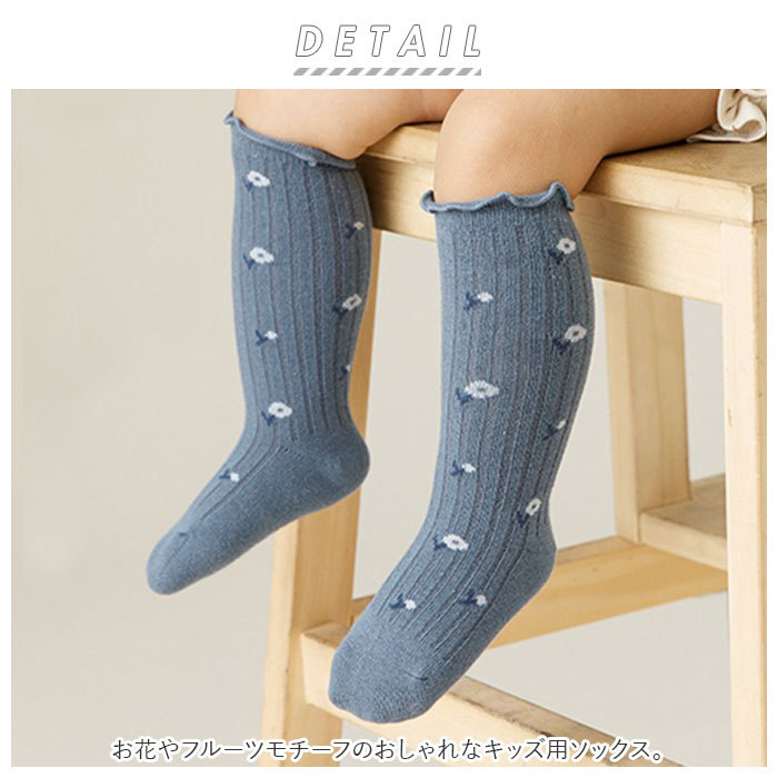 商品説明 | ・・お花やフルーツモチーフのおしゃれなキッズ用ソックス。 ・活発に動いても脱げにくいハイソックスタイプ。 ・柔らかく、お肌に優しい素材を使用。伸縮性もあり、締めつけ感のない快適な履き心地◎ ・履き口のフリルデザインがポイント!ゴムが入っていないので、跡がつきにくいのも嬉しい♪ ・デザイン違いで揃えるのもおすすめ。 |