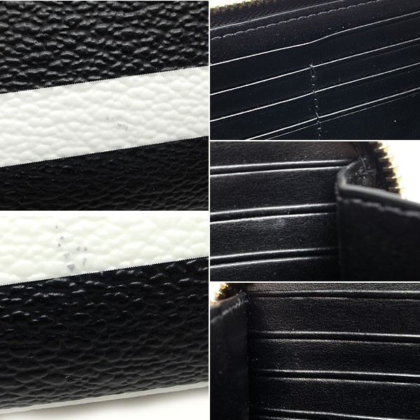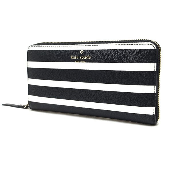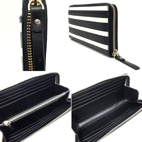 コメント ベーシックなフォルムにアイコニックなストライプパターンがマッチした、ケイトスペードのジップアラウンドタイプ長財布(ラウンドファスナー長財布)です。ゴールドカラーのフロントロゴが印象的です。小銭入れは取り外し可能でファスナー付ポーチとしてもお使い頂けます。背面にオープンポケット1、内側にカードスリット12、マチ付札入れ1、オープンポケット2、取り外し可能なファスナー付小銭入れ1には外側にカードスリット2を装備しています。正背面にわずかなヨゴレ、ファスナーレザーに多少のスレ、内側カードスリットと小銭入れに使用感が見られます。