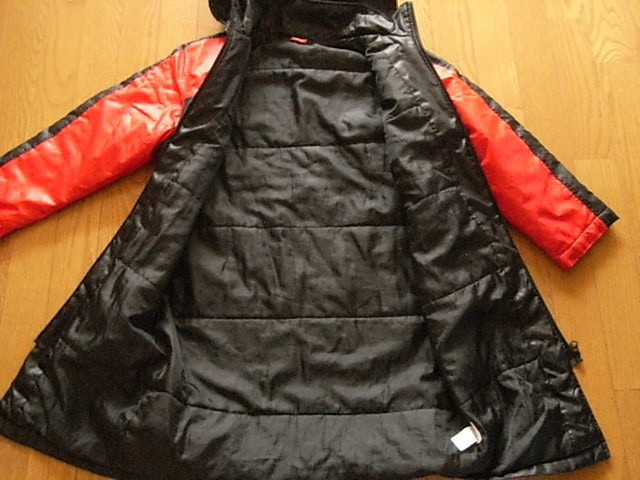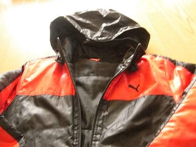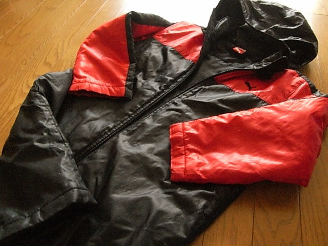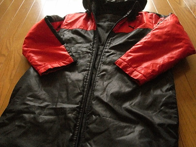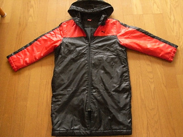 キッズ プーマ スポーツ ブルゾン コートです。サイズはキッズ140cmになります。平置き実測サイズは、肩幅約40cm、袖丈約48cm、着丈約84cm、身幅約53cmです。素人採寸のため多少の誤差はご了承ください。フードは取り外しが可能なタイプになります。全体色はブラック系&レッドラインのデザインになります。素材感もとても良く、プーマらしいとてもかっこいいスポーツデザインです。着用感がありますので、あくまでも中古でありますことを御了承願います。ノークレーム・ノーリターンでお願いします。送料込み(クロネコ便等発送)になります。