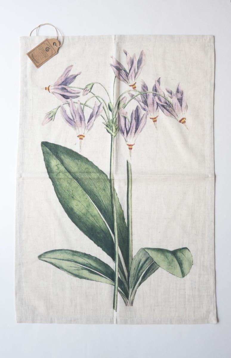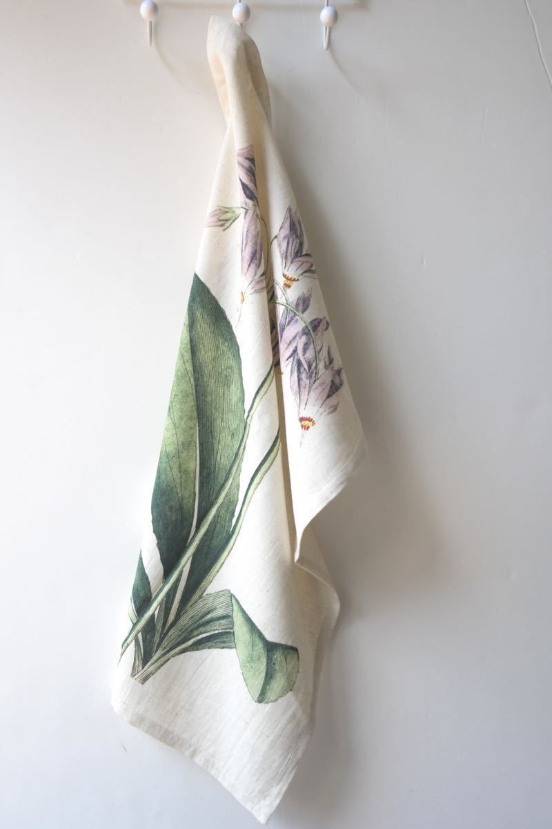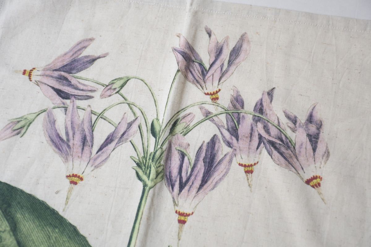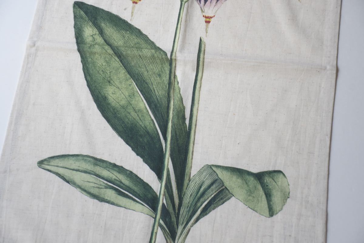 花の図鑑のプリントが施されたトーション。壁に絵の様にタペストリーとして飾ったりとボタニカルスタイルをお楽しみ下さい。