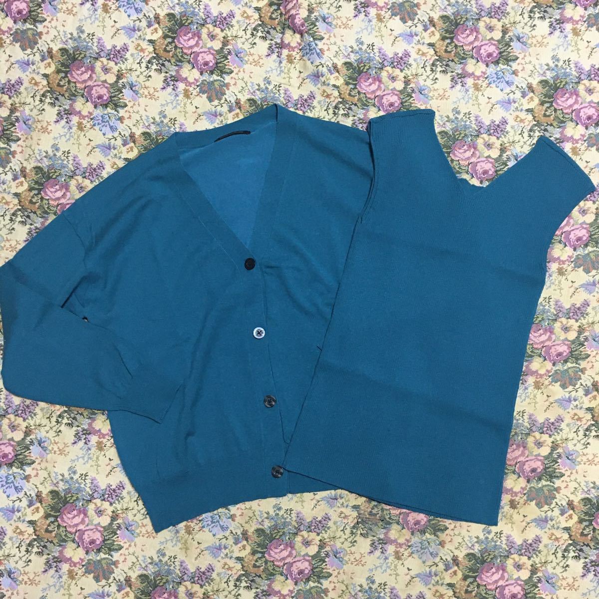 カーディガンとインナーのリブニットはそれぞれ単品でも着回せる、便利なアンサンブルです。