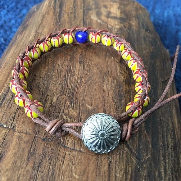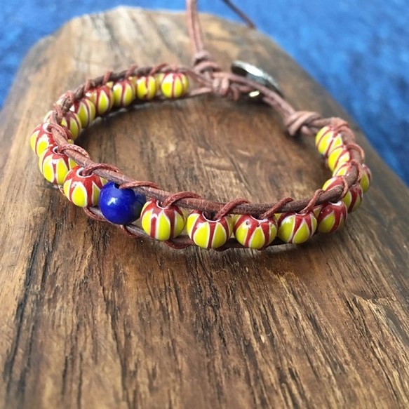 とんぼ玉とラピスラズリのレザーラップブレスレット
