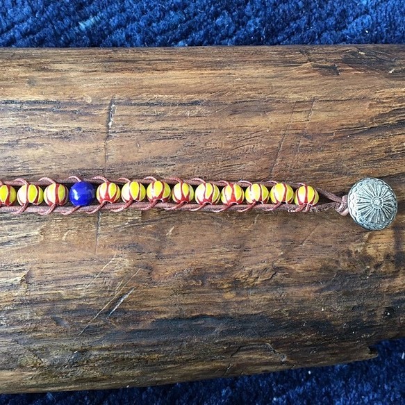 気色と赤のコントラストが個性的でかっこいい、とんぼ玉のブレスレット。