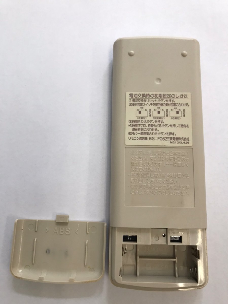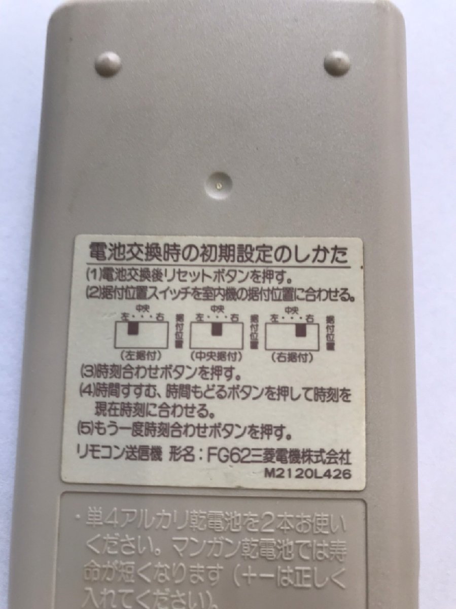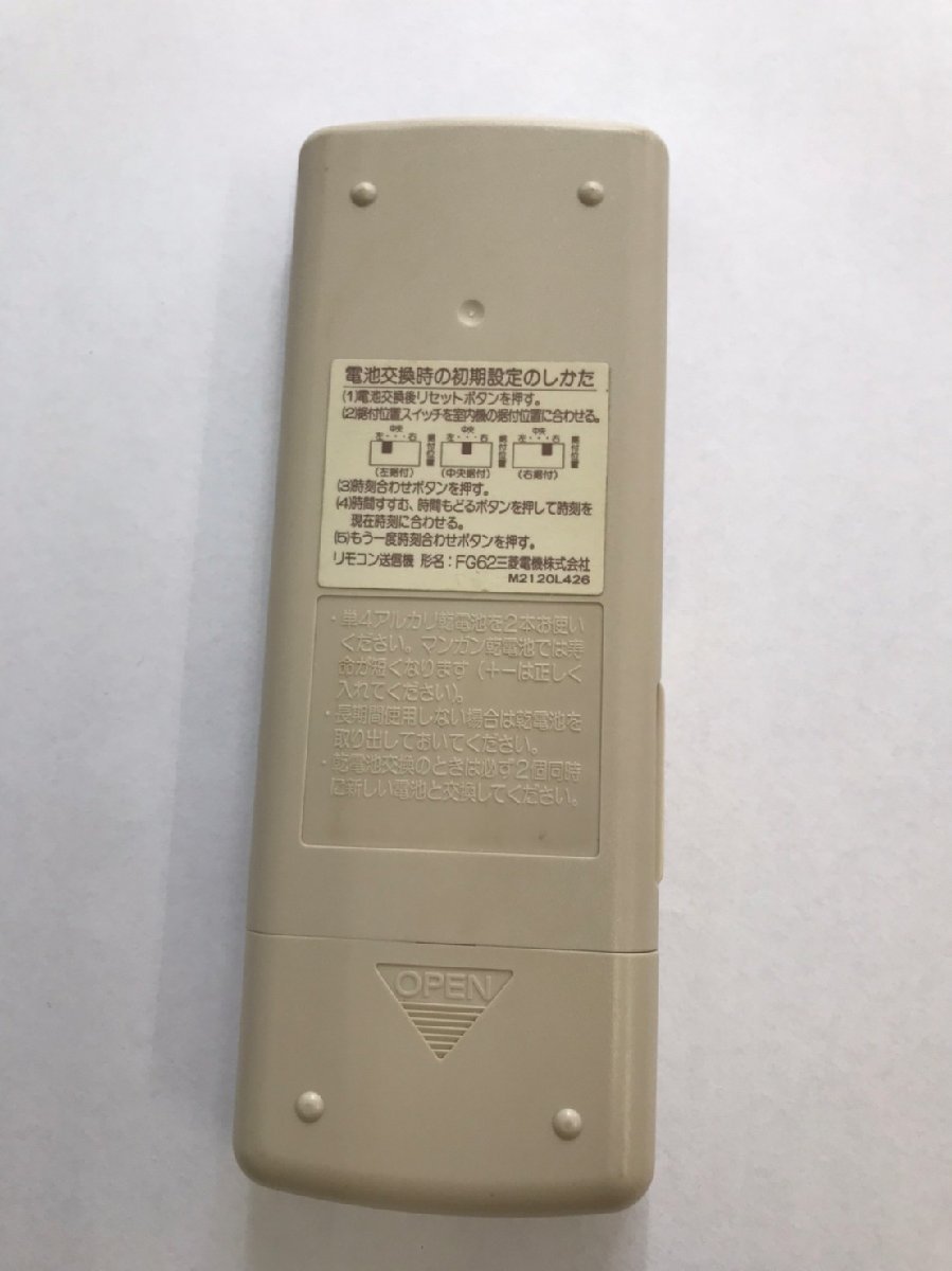 【MITSUBISHI 三菱 FG62 電池付き】リモコンのみの販売です。赤外線チェック済/クリーニング済。全体的にきれいな商品ですが中古商品という事をご理解のうえご購入ください。 電池を入れて到着したらすぐ使えるようにしてお送りします。 電池は接触しないように紙を挟んでおりますので、到着したら引き抜いてからご利用ください。 電池や設定の問題を解決し、使用できるようになっています。 使用できない場合は到着後3日以内にまずストアにご相談をお願いします。 設定の問題、対応機種間違い、本体側の問題等、商品説明に書いてある不良を除き保証対象外です。 対応機種についてのご質問はお答えできかねます。 各メーカーへお問い合わせいただくか、検索から各機種の取扱説明書をご確認ください。 中古リモコンは現品限りとなりますので、ご希望の商品がございましたらお早めにご購入ください。 ※他店でもこちらと同じ中古リモコンを販売しております。そのため他店でお客様より先に購入があった際は、大変申し訳ございませんがご購入いただいた商品はキャンセルとさせていただきます。あらかじめご承知ください。