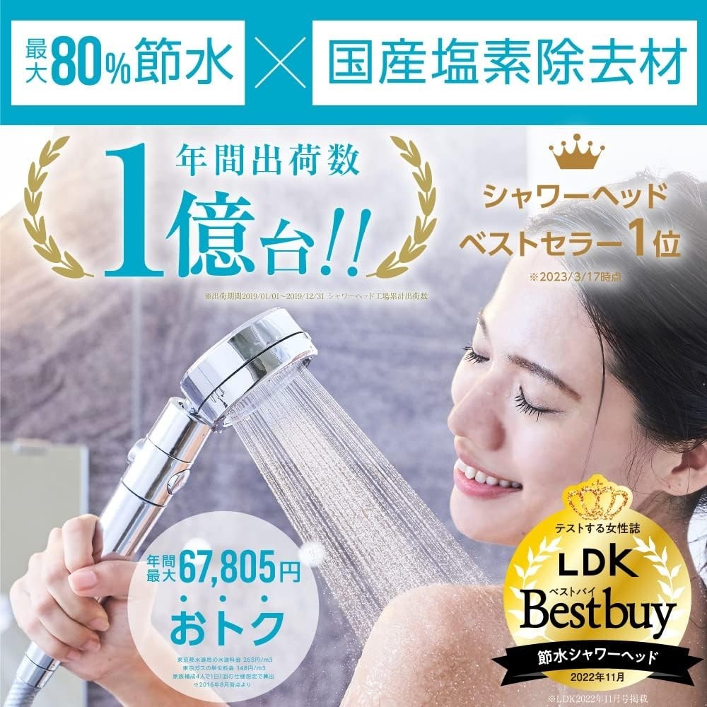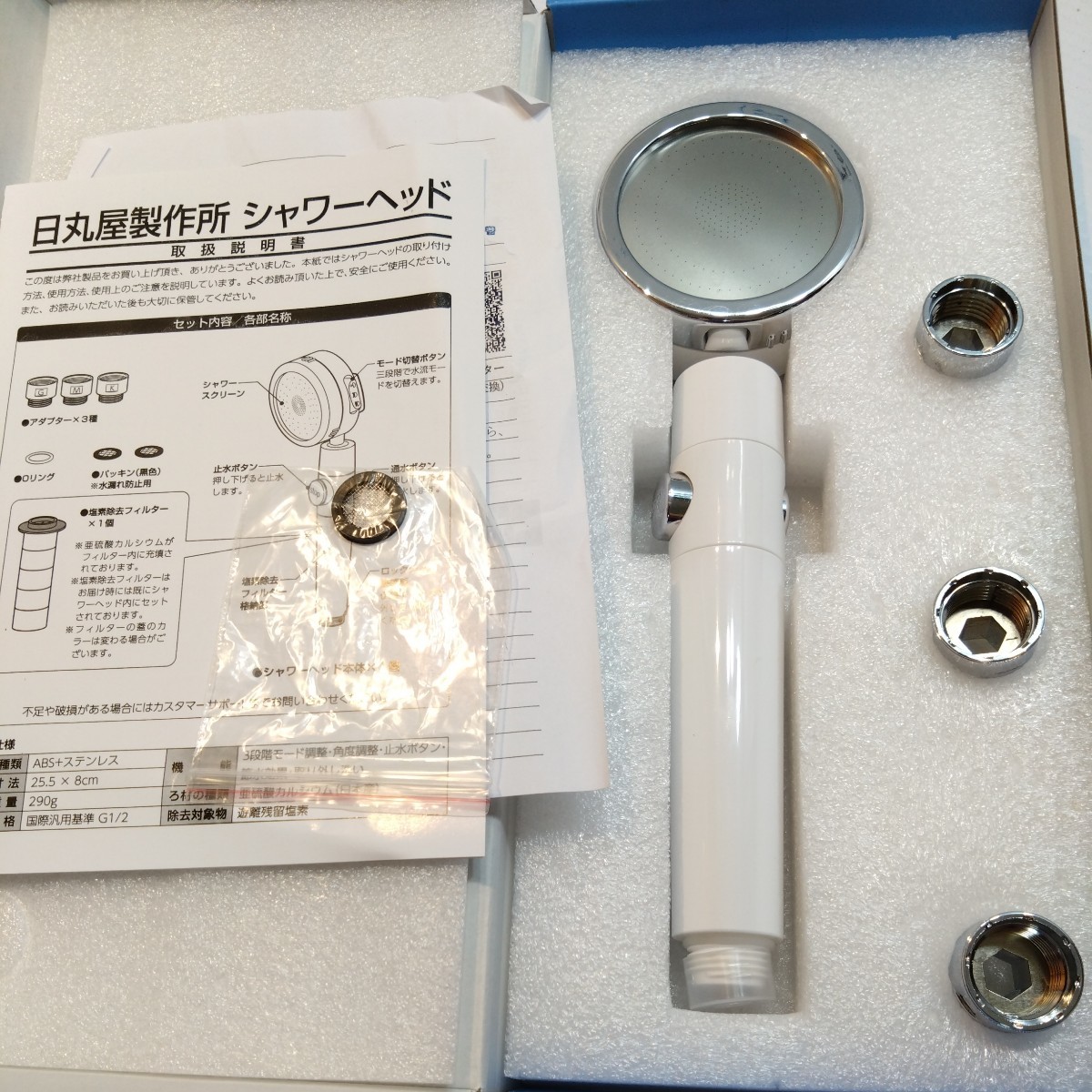 日丸屋製作所 シャワーヘッド 日本製塩素除去剤 節水 浄水 止水ボタン 水流調整 角度調整 アダプター付 国際基準G1/2 (ホワイト)