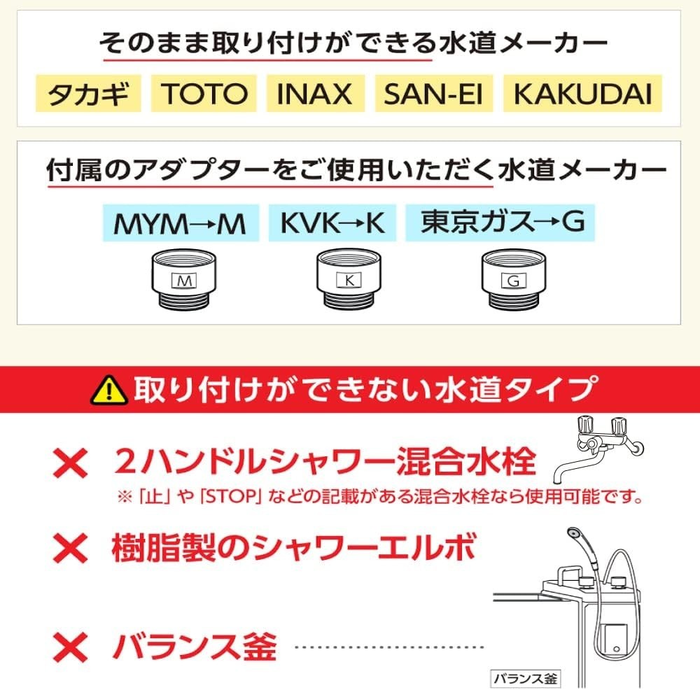対応ホースメーカー ①そのまま取り付けられるメーカー(ネジ規格:G1/2):タカギ、TOTO、SAN-EI、LIXIL(INAX)、KAKUDAI ②付属アダプタとゴムリングと使用:MYM、KVK、東京ガス ご注意バランス釜/逆止弁がない2ハンドル混合栓には取り付けできません。また節水シャワーヘッドのため集合住宅などでは水圧が弱まる場合がございます。