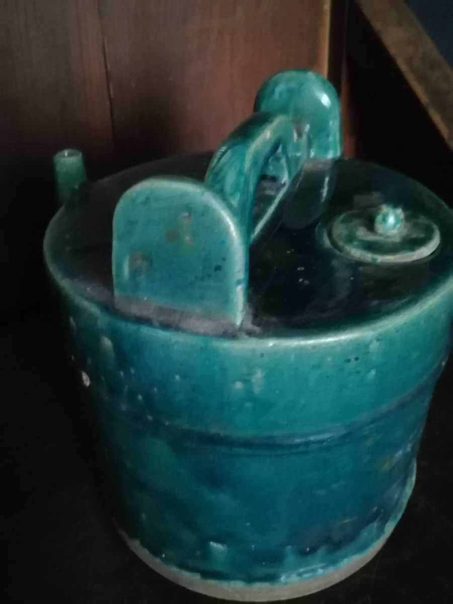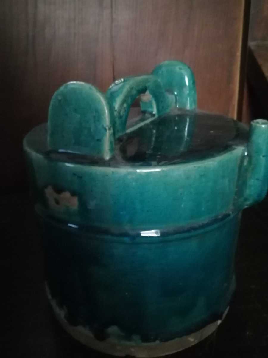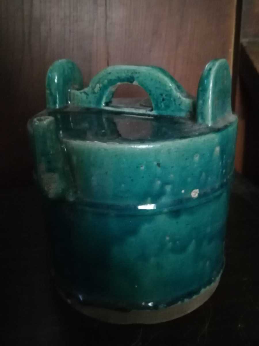 樽の型をした緑釉の酒器です。小さな注ぎ口と蓋が付いた持ち手のある形態です。古典的な古代青銅器を連想させます。16世紀頃の南方中国広東辺りの製品と思われます。緑釉の上がりが良くキズの少ない酒器です。